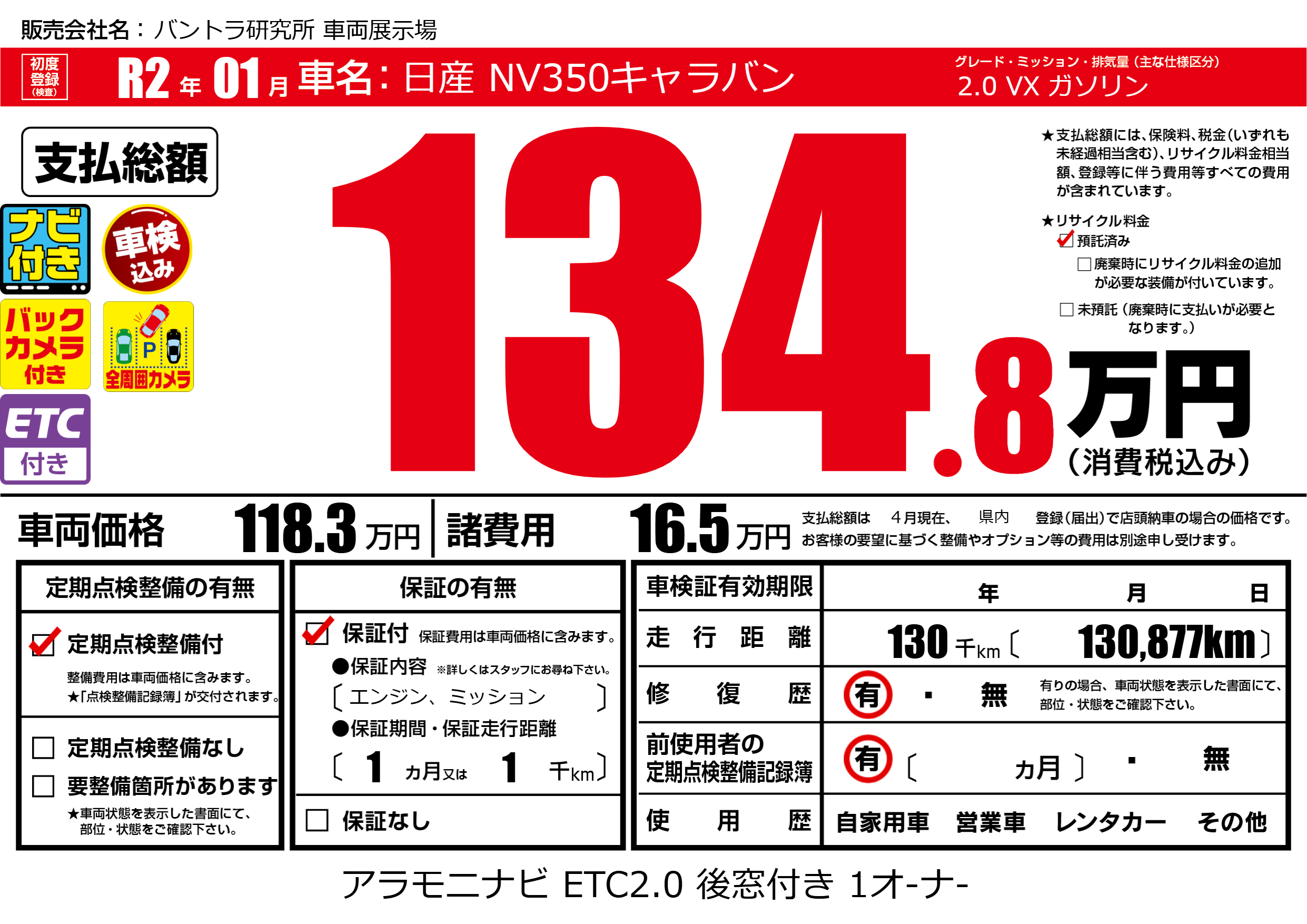 | 車名 | 日産 NV350キャラバン | グレード ミッション 排気量 |
