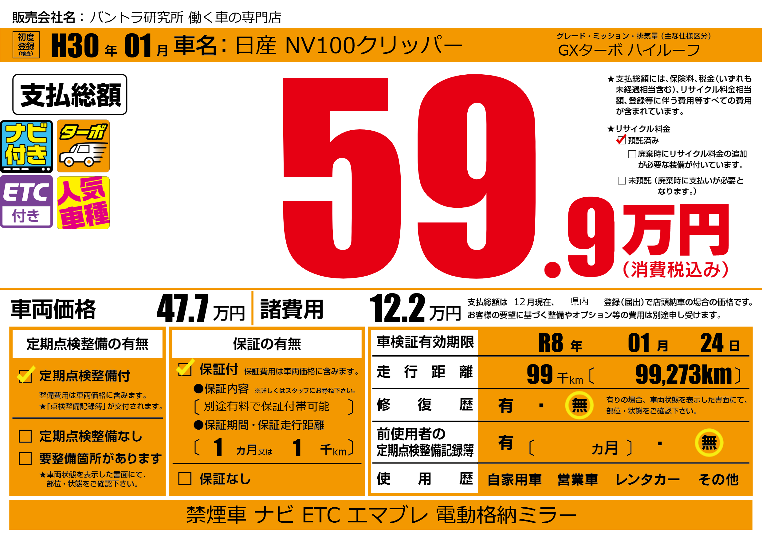 | 車名 | 日産 NV100クリッパー | グレード ミッション 排気量 |