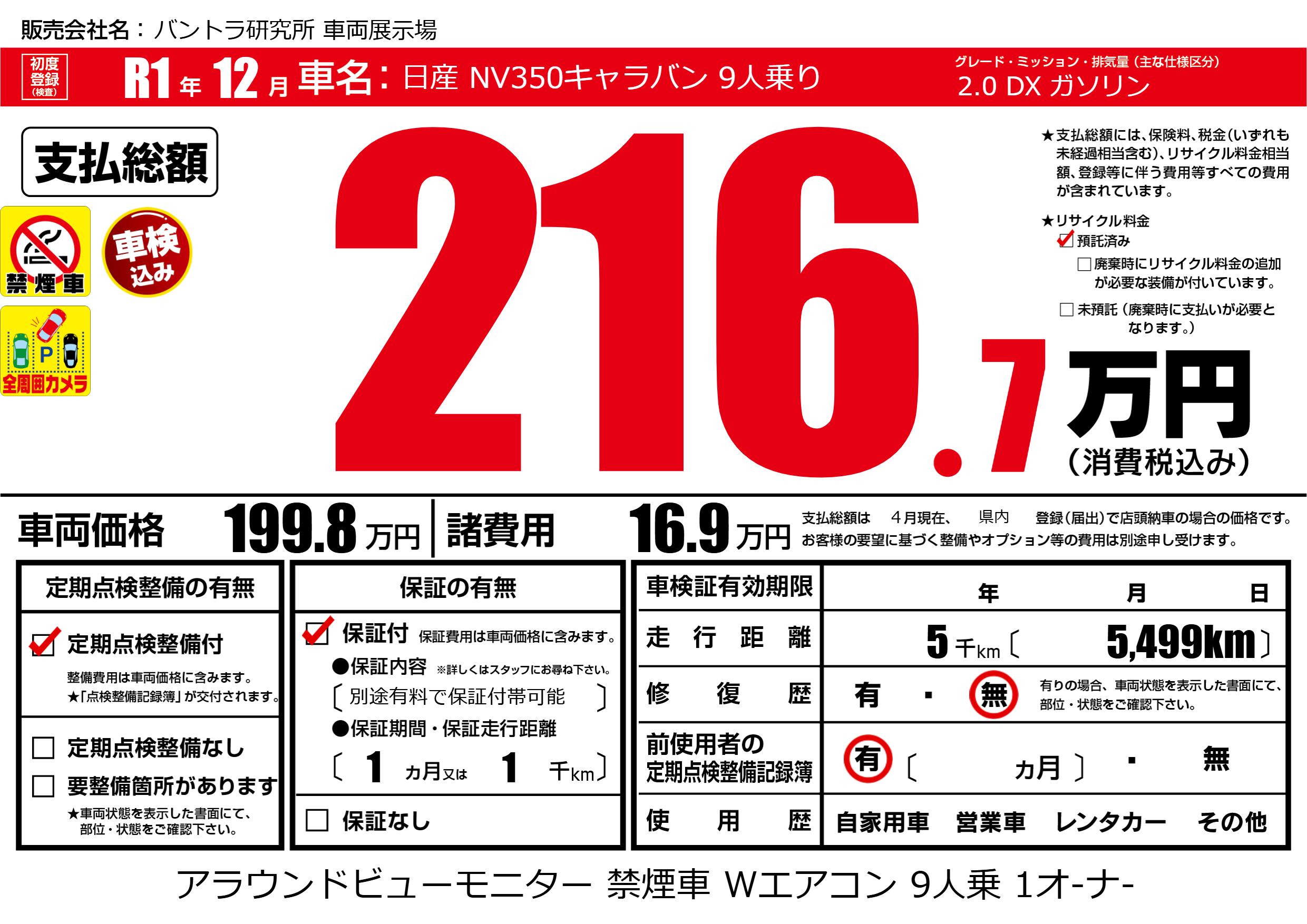 | 車名 | 日産 NV350キャラバン 9人乗り | グレード ミッション 排気量 |
