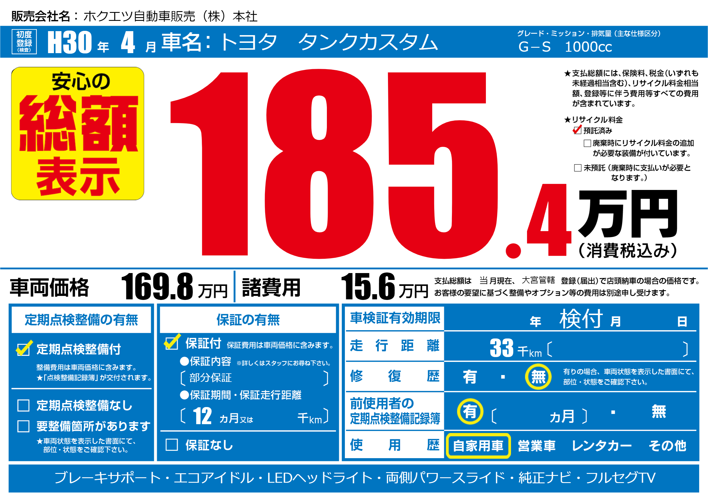 | 車名 | トヨタ タンクカスタム | グレード ミッション 排気量 |