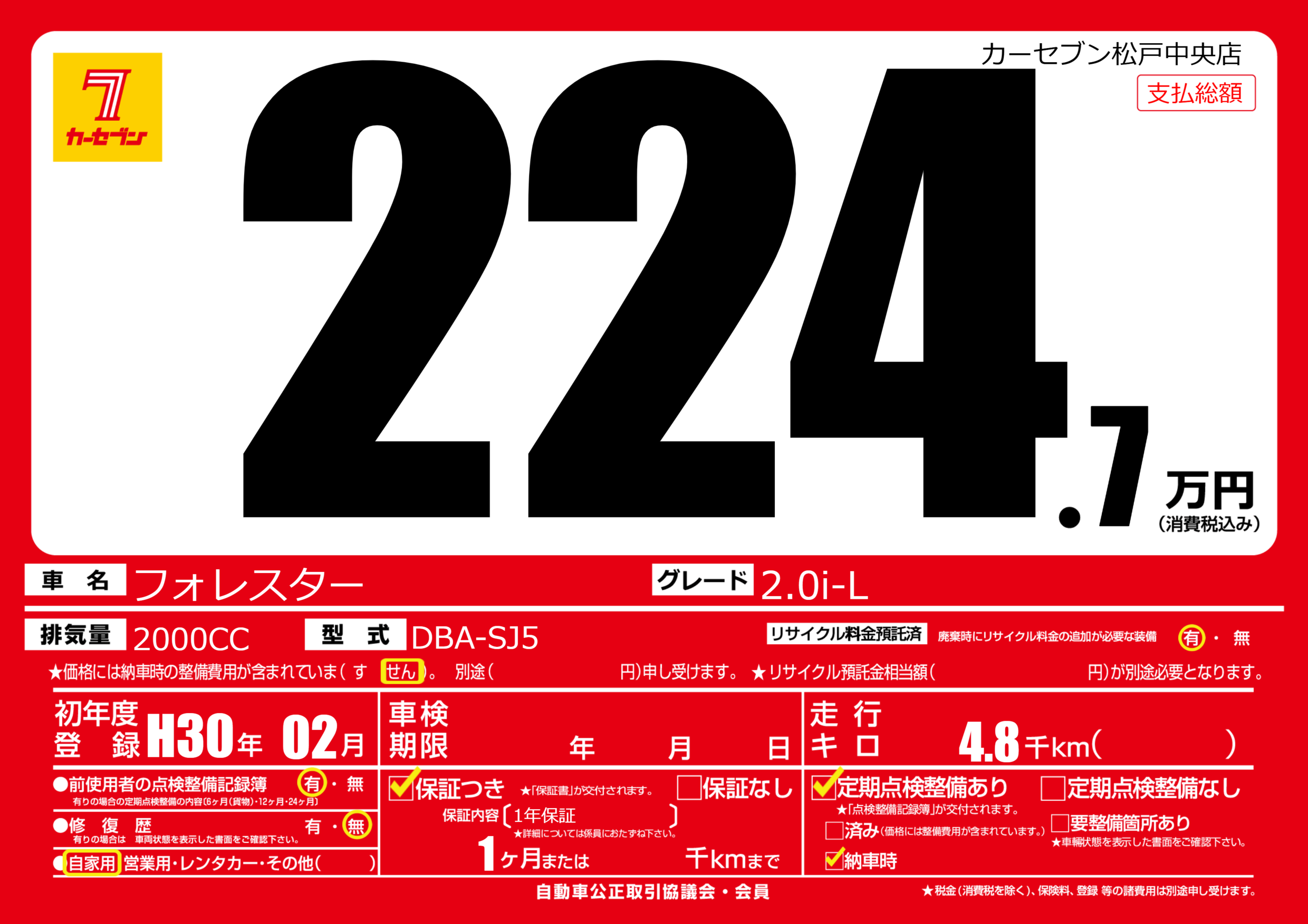 | 車名 | フォレスター | グレード ミッション 排気量 |