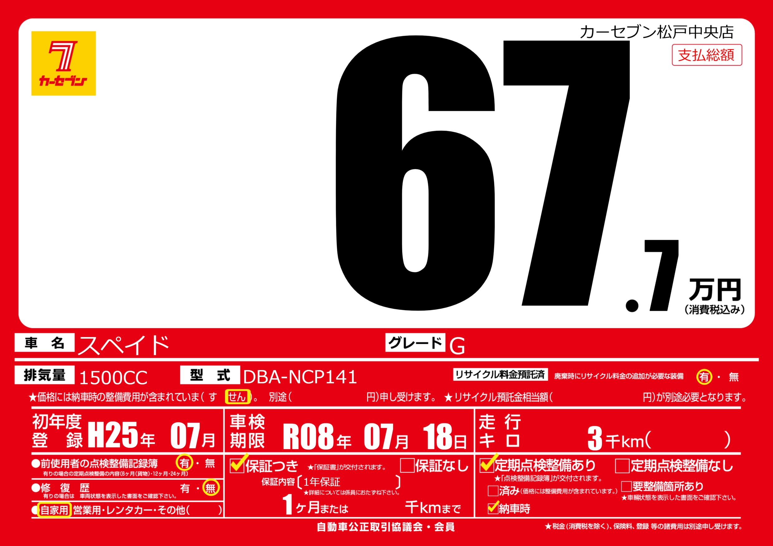 | 車名 | スペイド | グレード ミッション 排気量 |