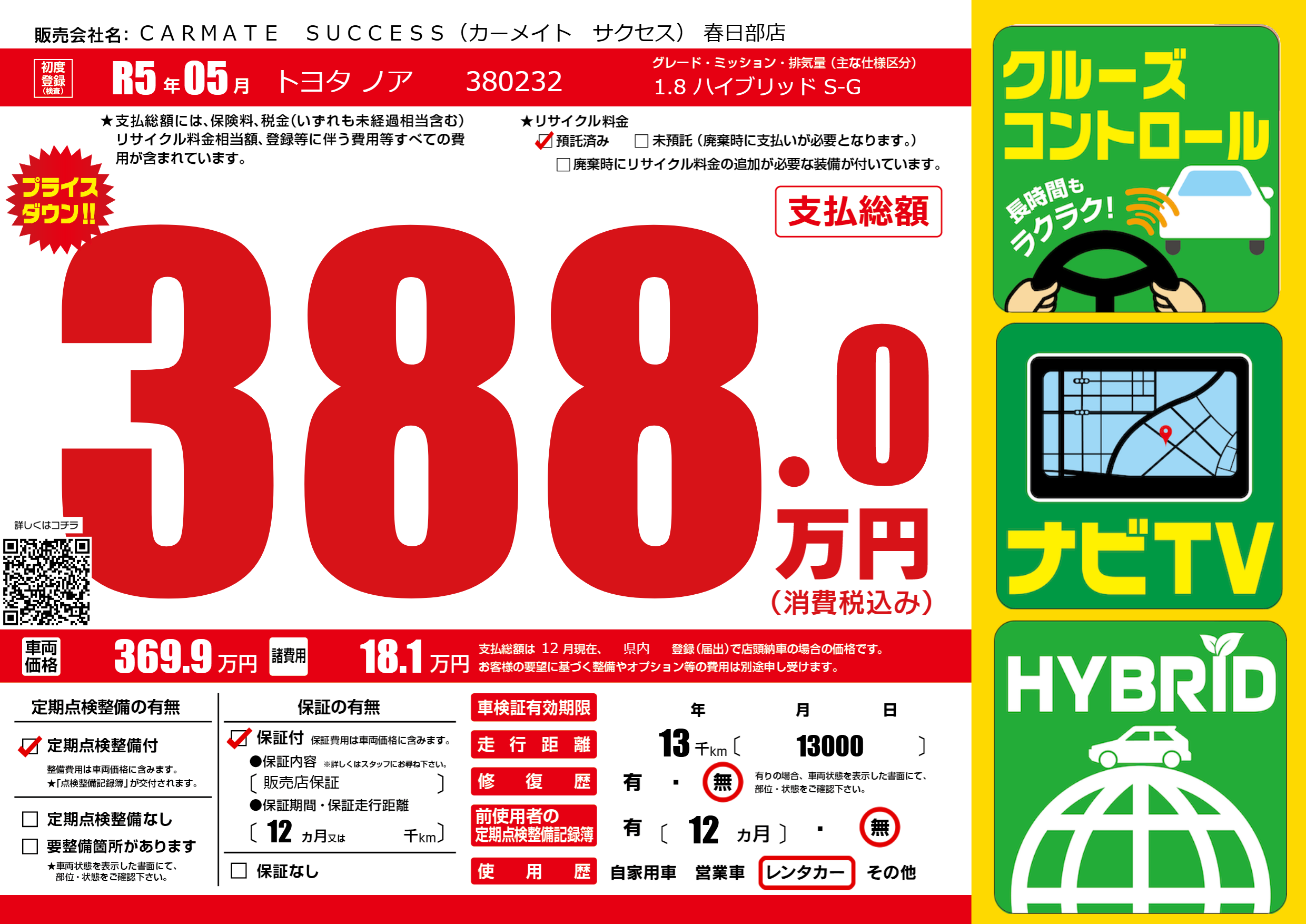 | 車名 | トヨタ ノア 380232 | グレード ミッション 排気量 |