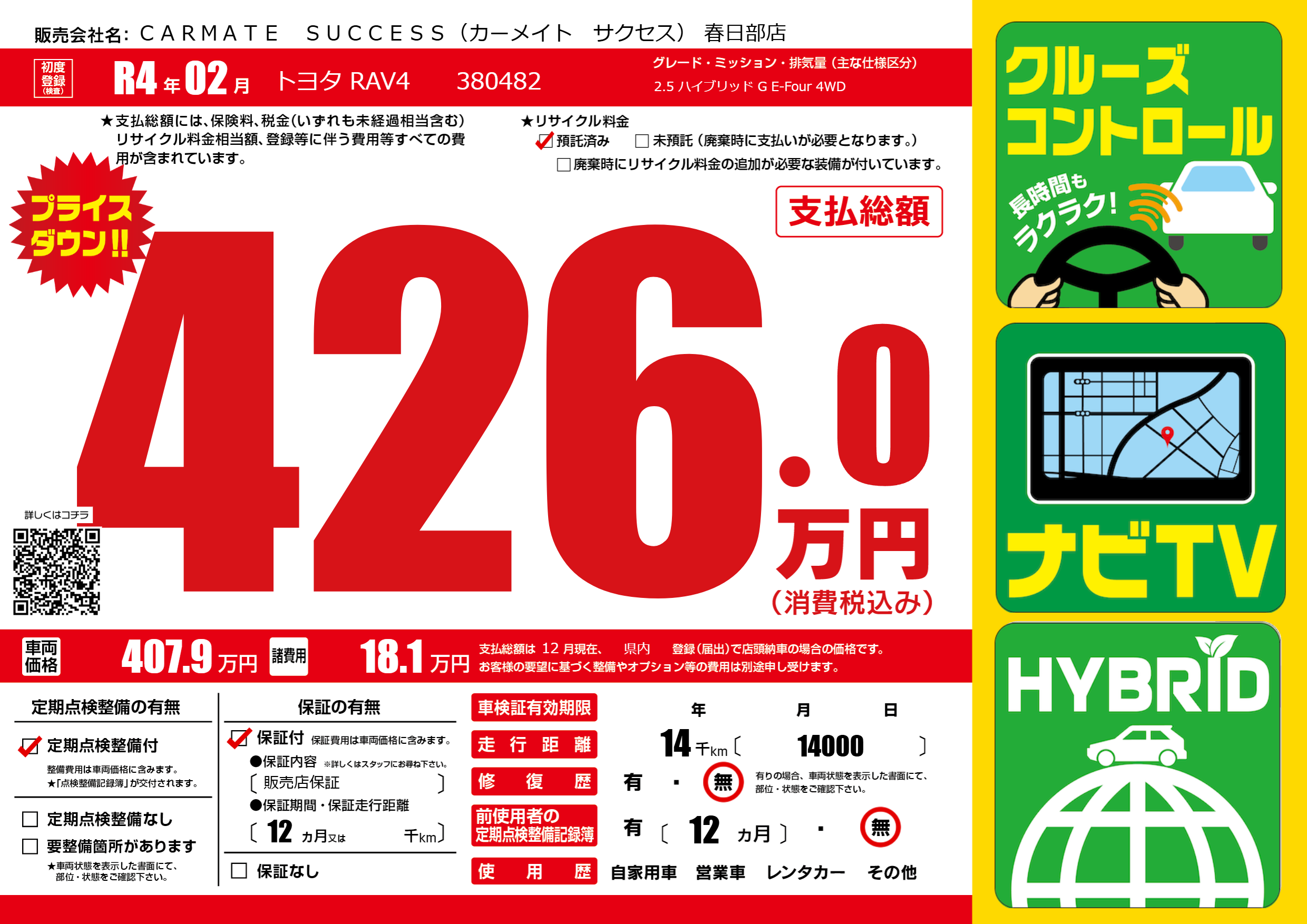| 車名 | トヨタ RAV4 380482 | グレード ミッション 排気量 |