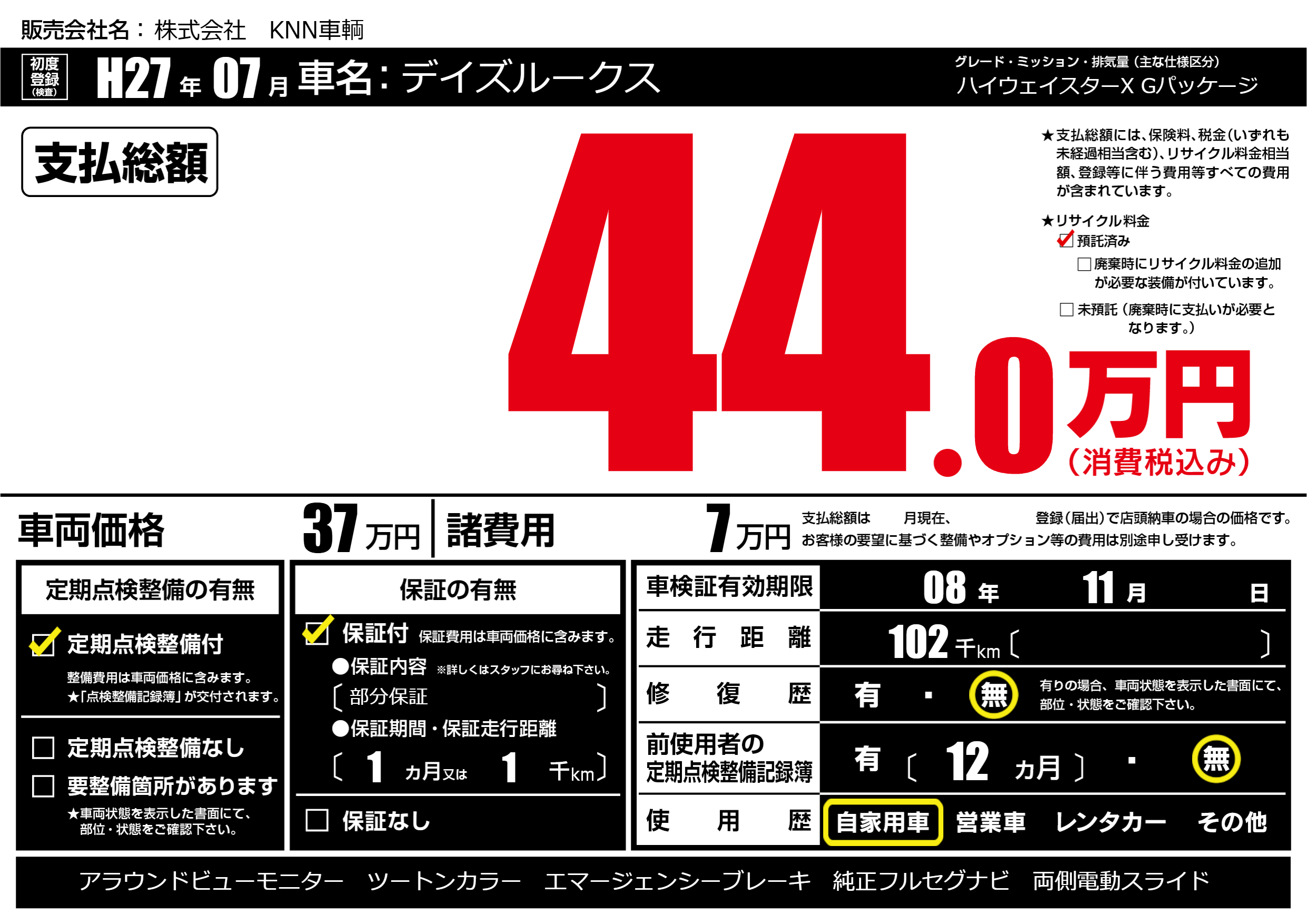 | 走行キロ | 10.2万km | 初年度登録 | H27年07月 |