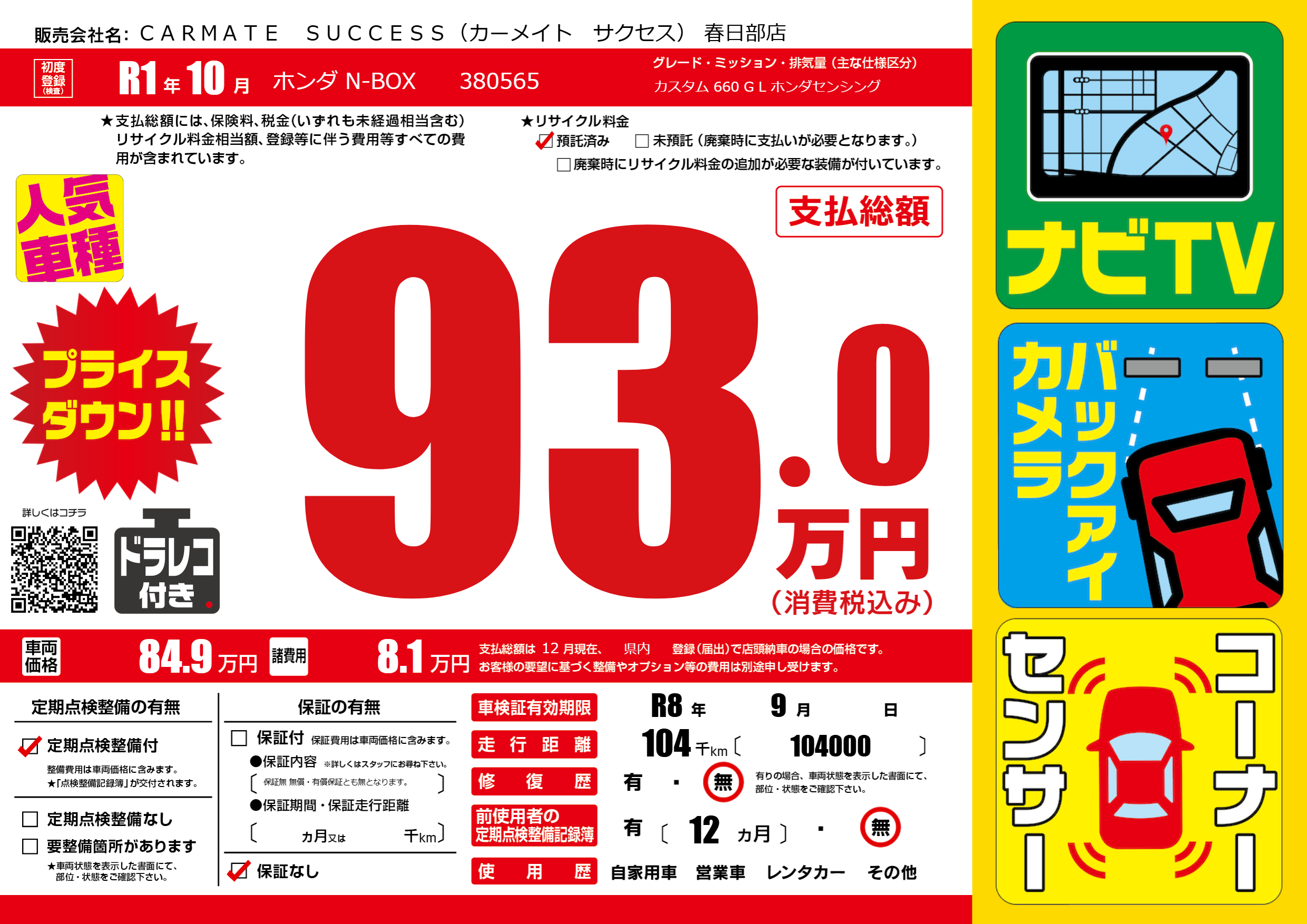 なし | 車検制限 | R8年9月---月 |