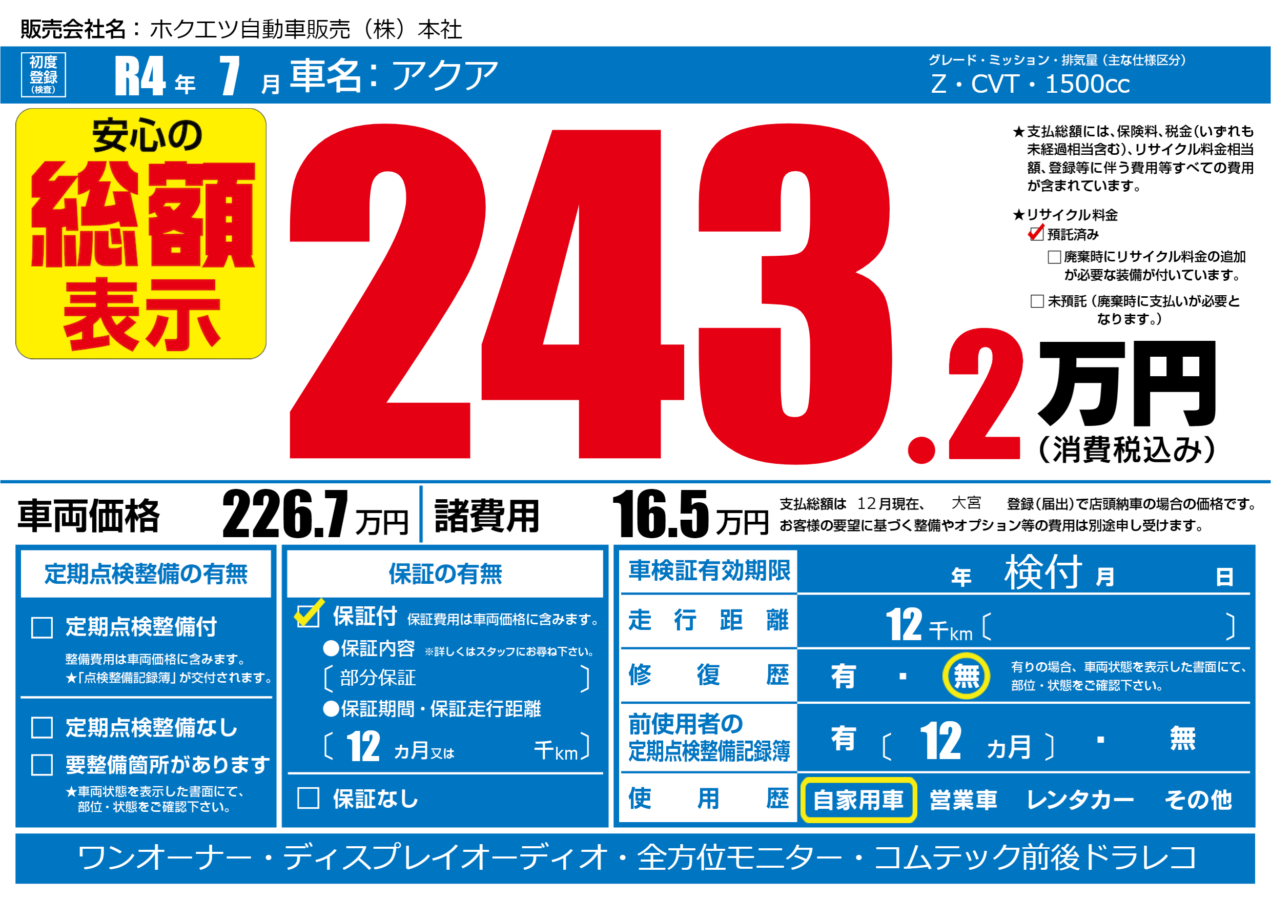 | 走行キロ | 1.2万km | 初年度登録 | R4年7月 |