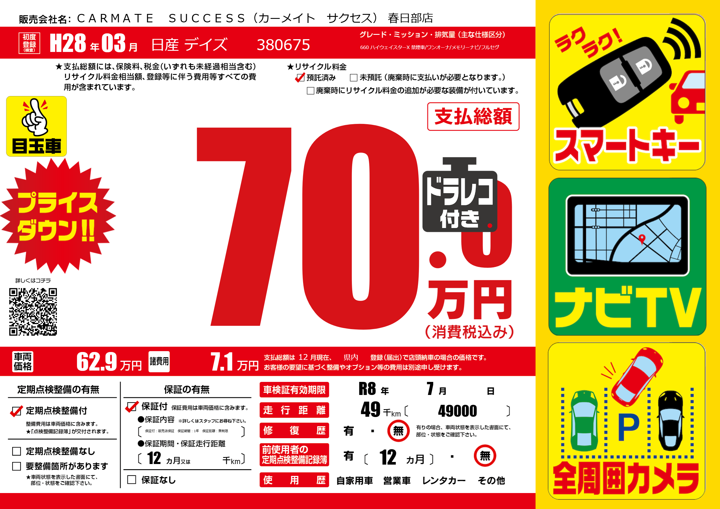 | 車名 | 日産 デイズ 380675 | グレード ミッション 排気量 |