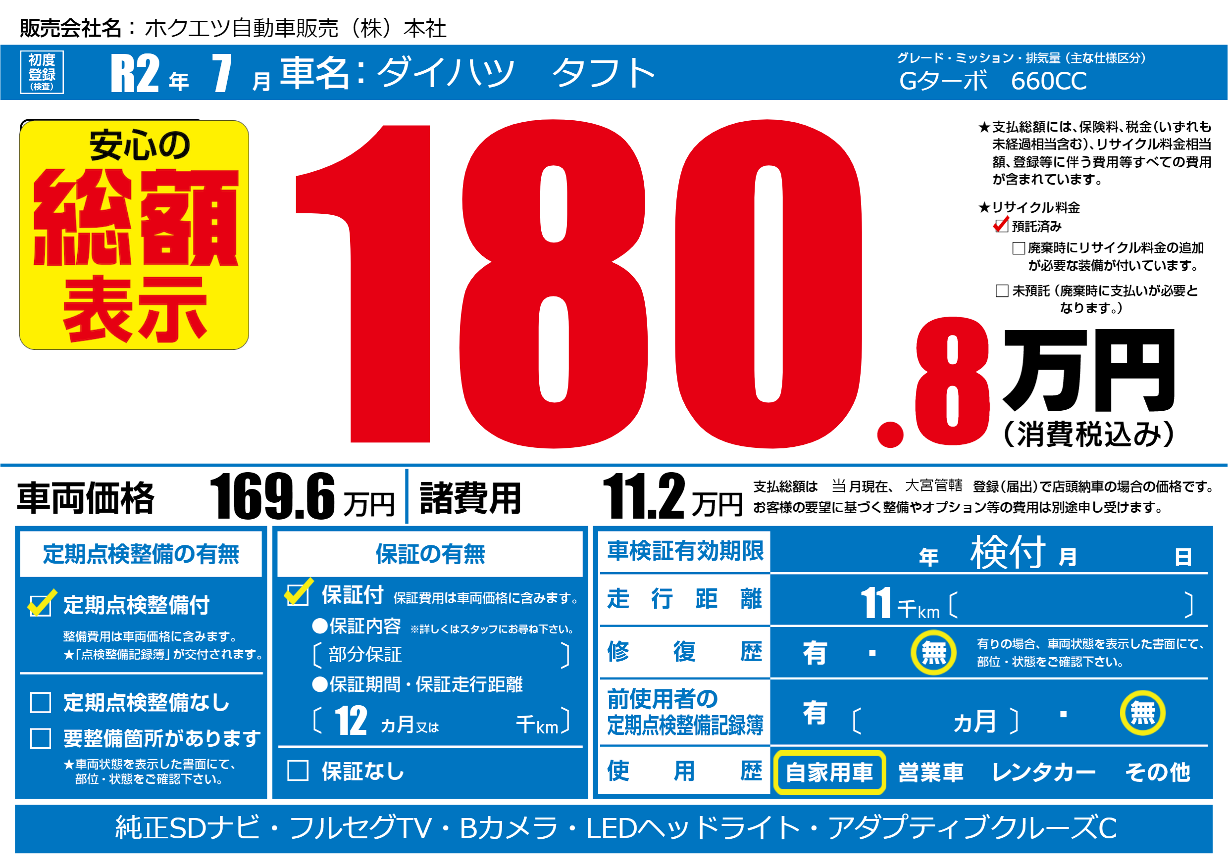 | 走行キロ | 1.1万km | 初年度登録 | R2年7月 |