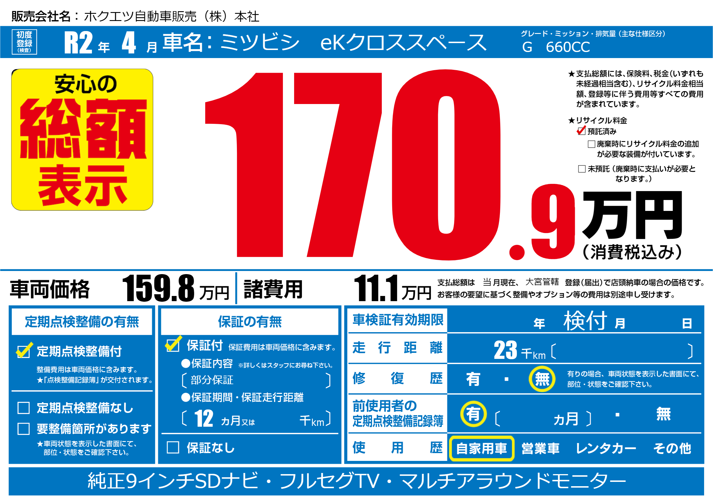 | 車名 | ミツビシ eKクロススペース | グレード ミッション 排気量 |