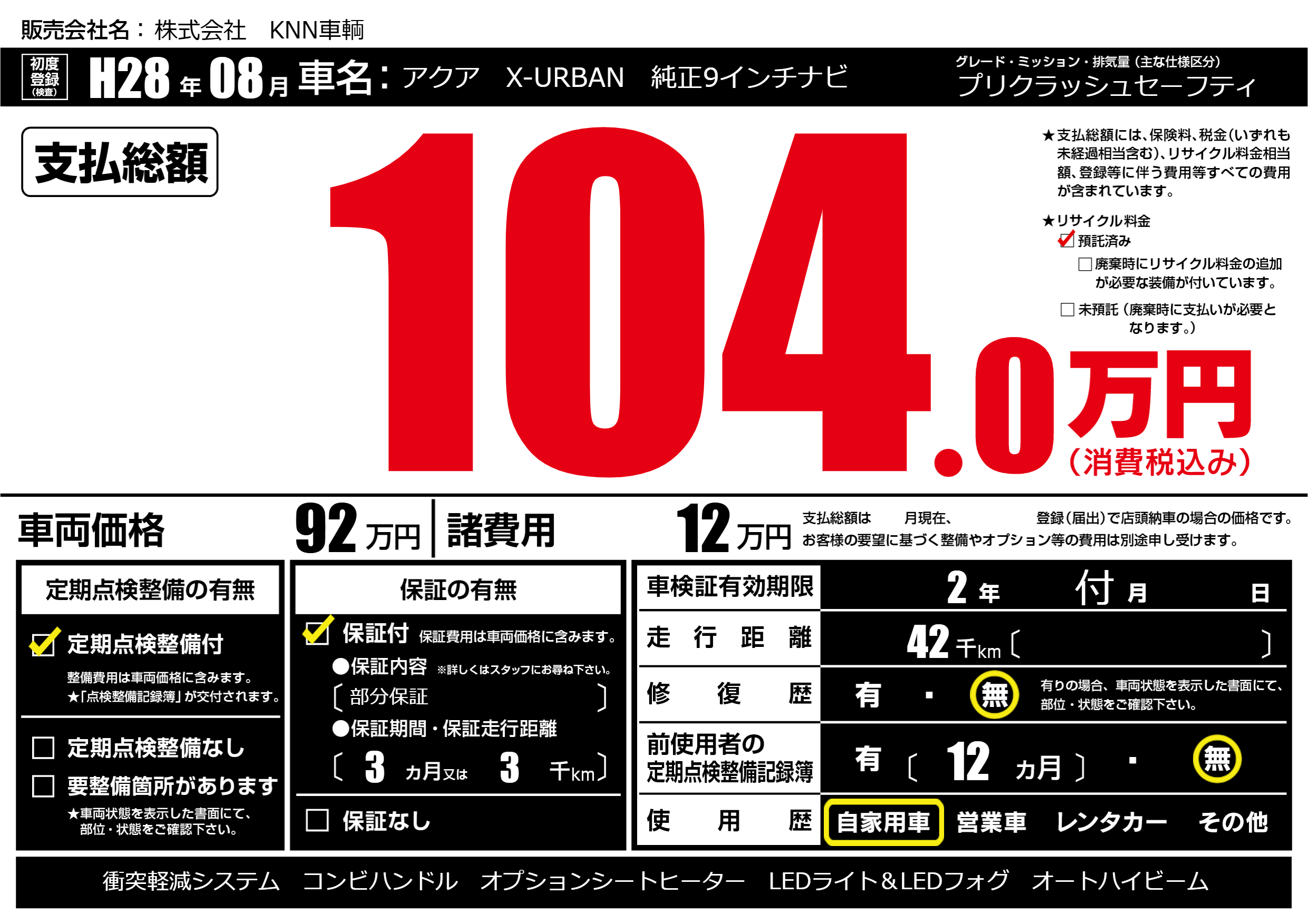 | 車名 | アクア X-URBAN 純正9インチナビ | グレード ミッション 排気量 |