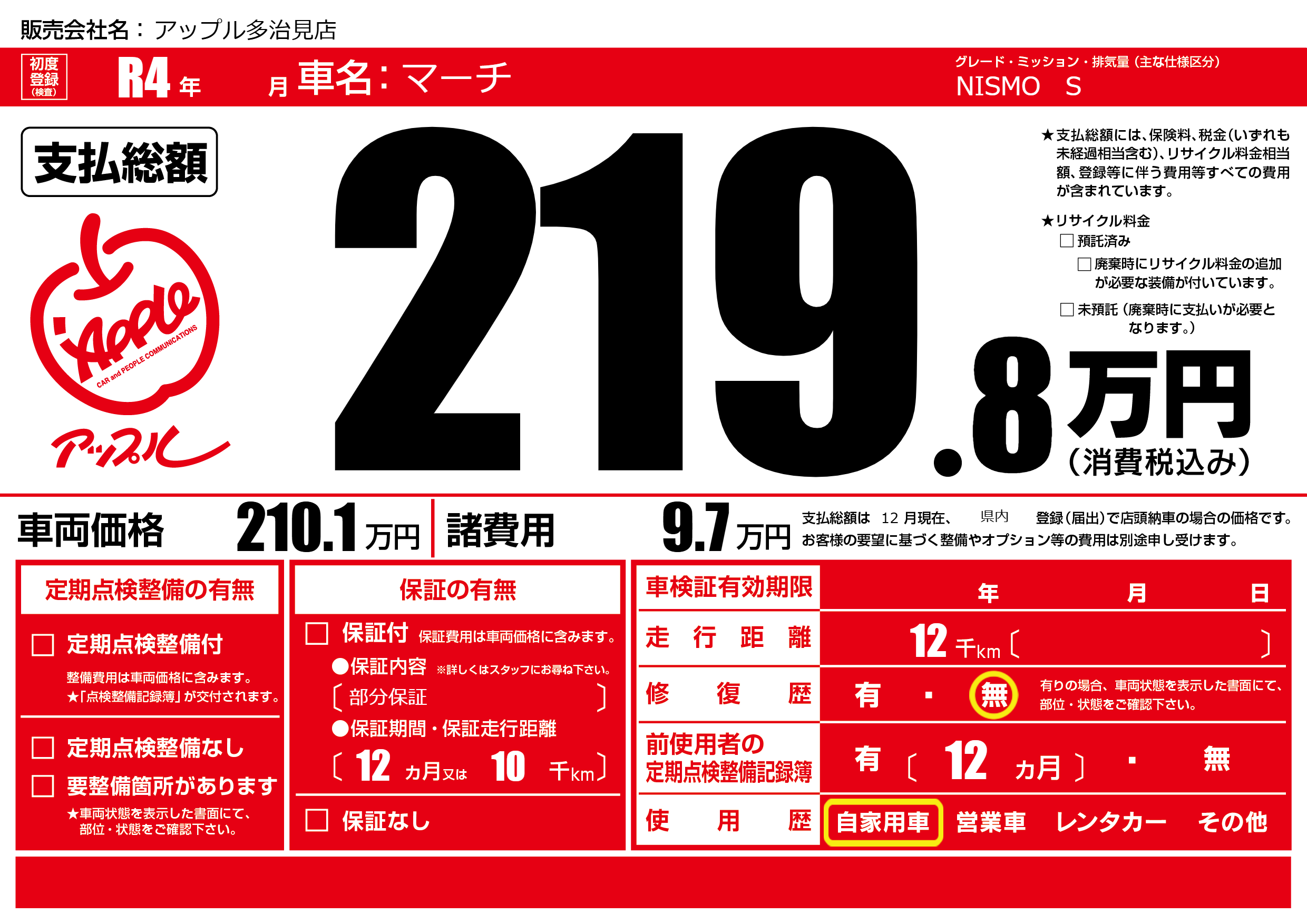 保証なし 保証内容(部分保証) 12ヶ月または(10)千kmまで |