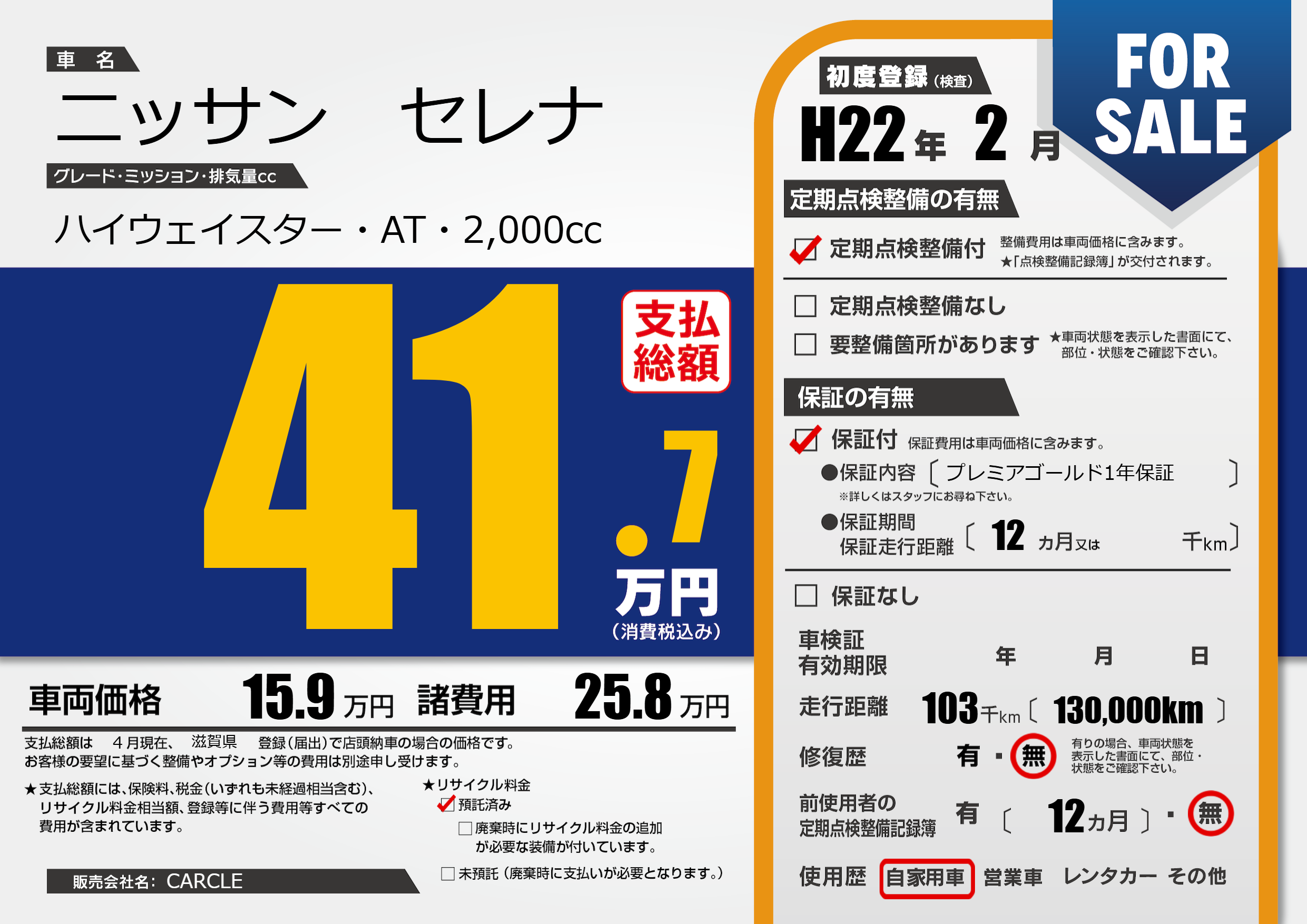 | 走行キロ | 10.3万km | 初年度登録 | H22年2月 |
