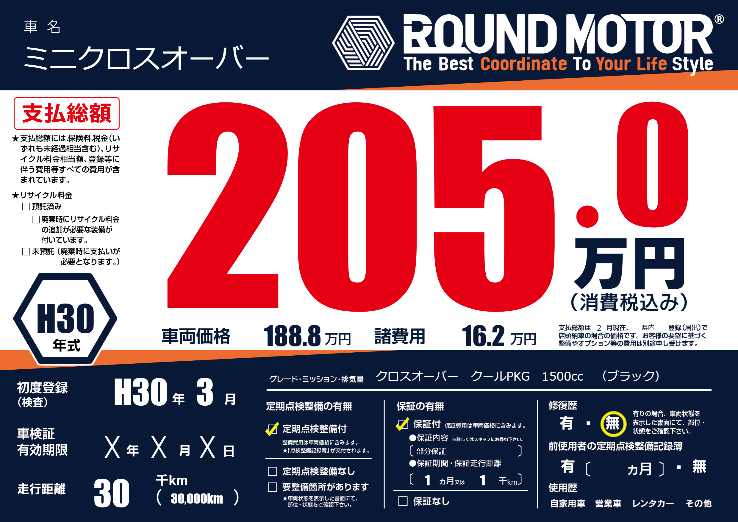 | 走行キロ | 3万km | 初年度登録 | H30年3月 |