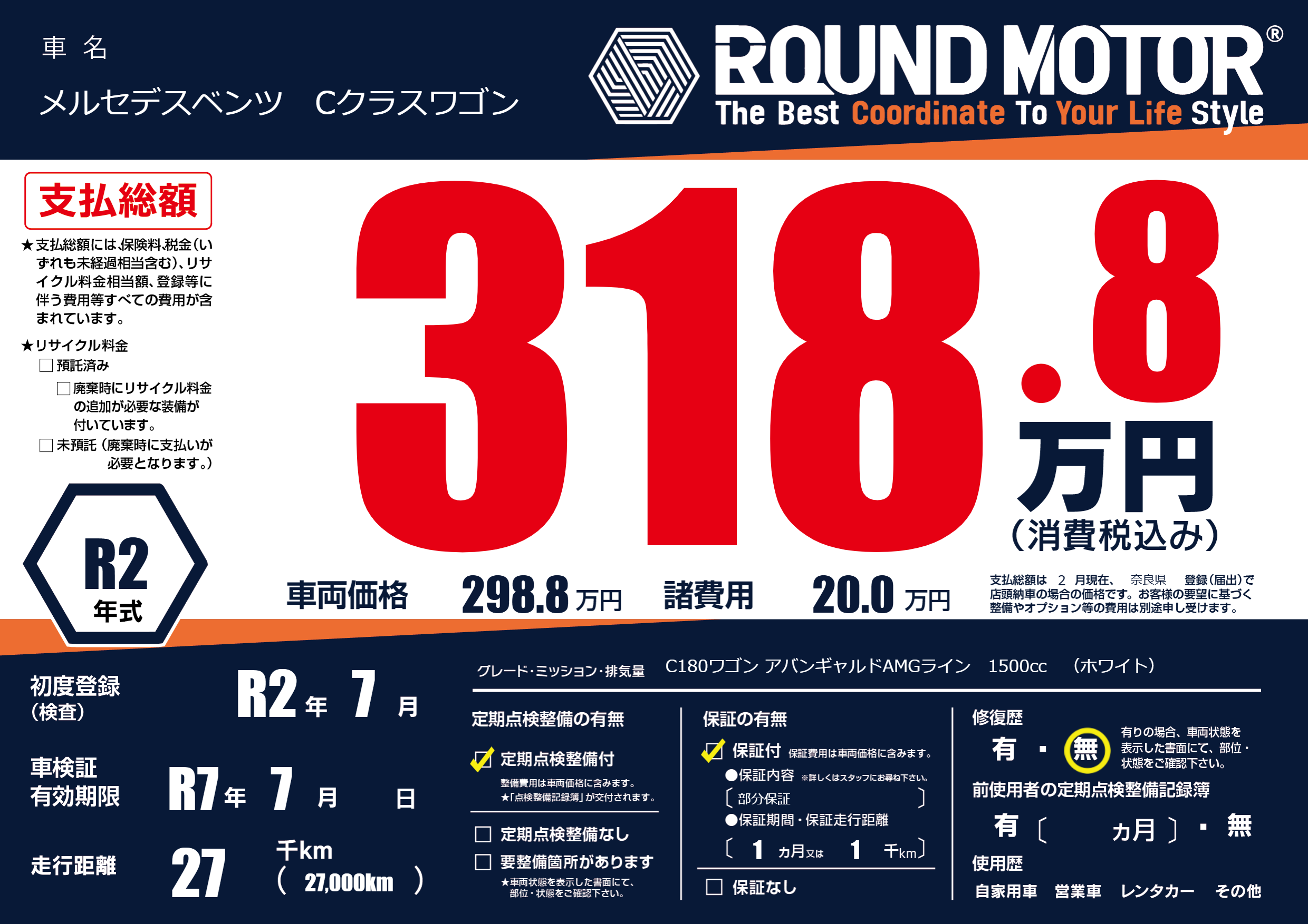 | 車名 | メルセデスベンツ Cクラスワゴン | グレード ミッション 排気量 |