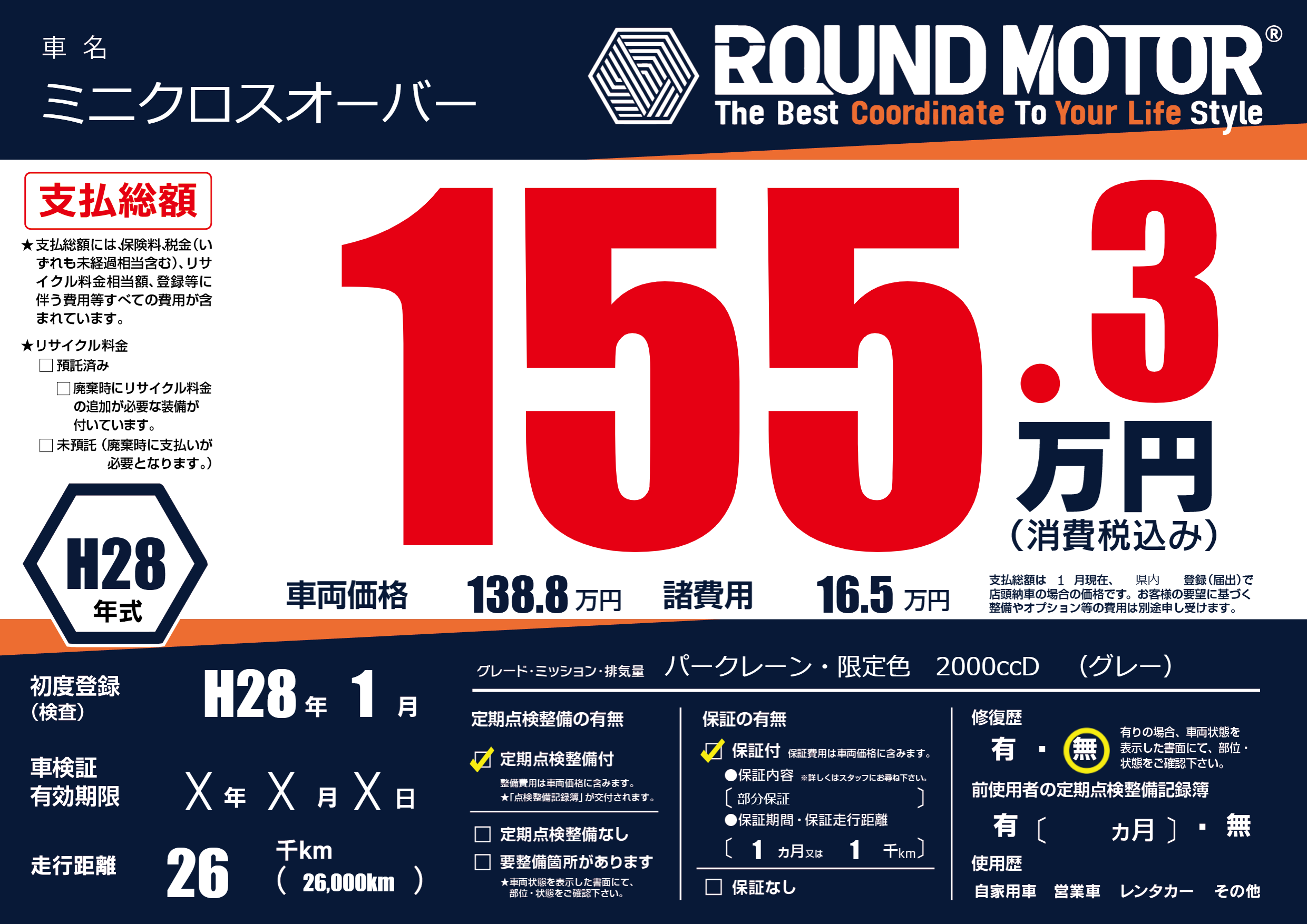 | 走行キロ | 2.6万km | 初年度登録 | H28年1月 |