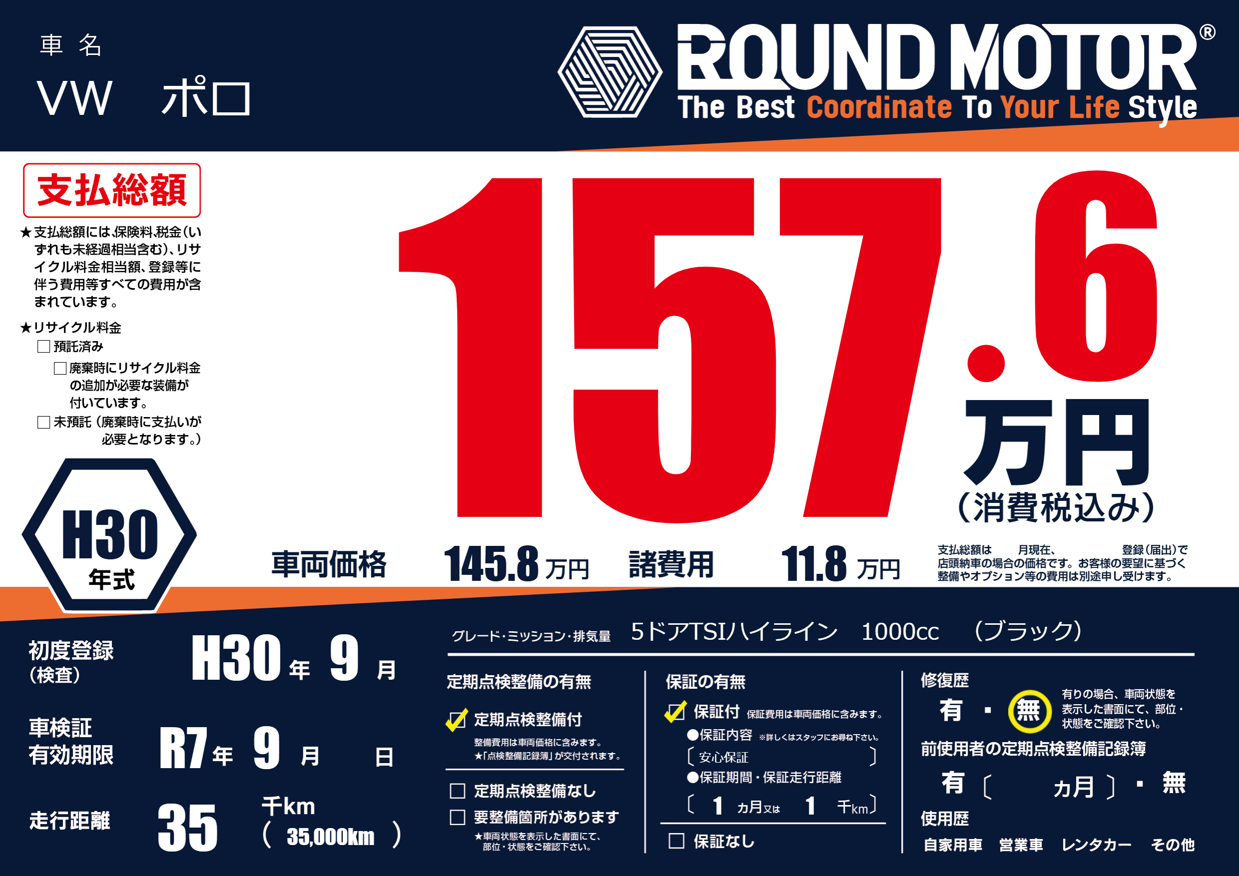 | 車名 | VW ポロ | グレード ミッション 排気量 |