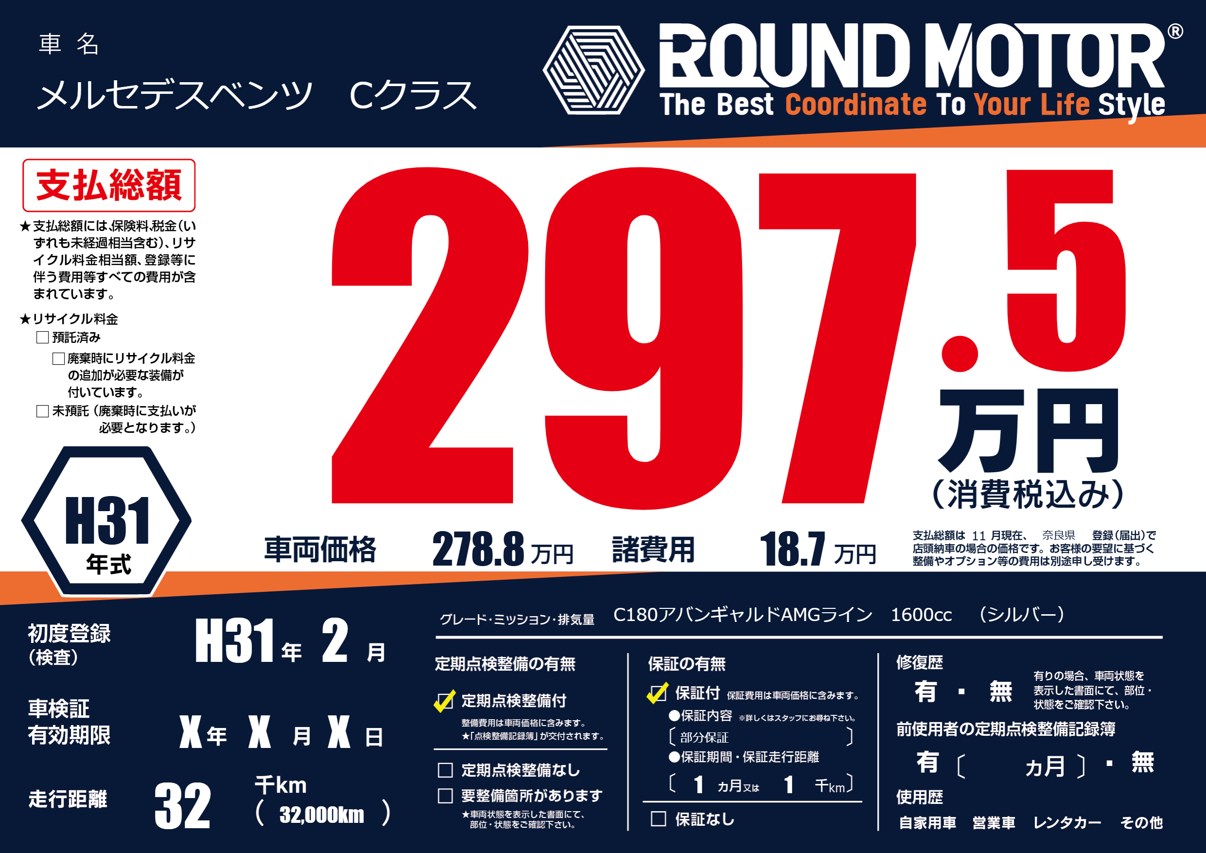 | 車名 | メルセデスベンツ Cクラス | グレード ミッション 排気量 |