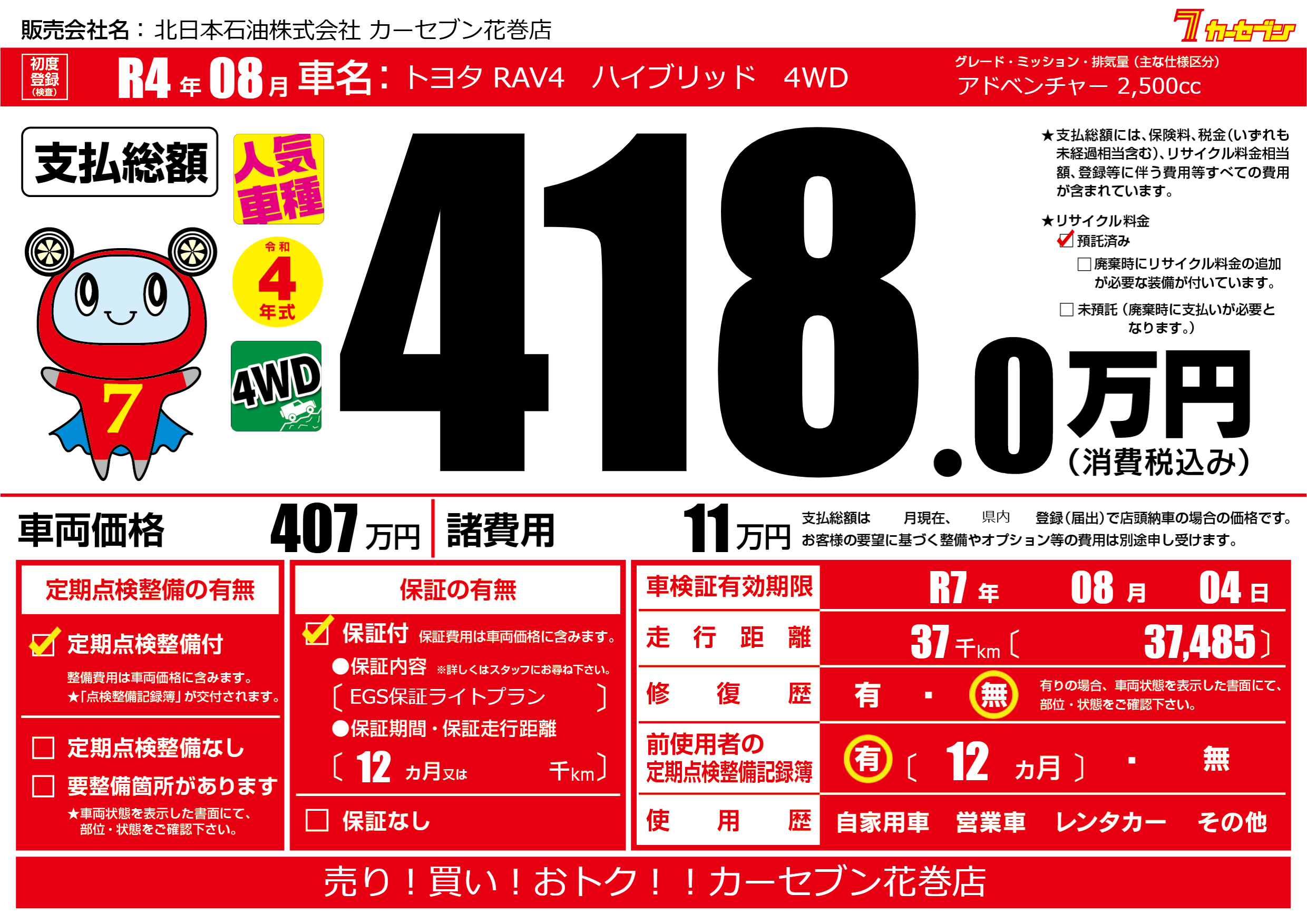 | 走行キロ | 3.7万km | 初年度登録 | R4年08月 |