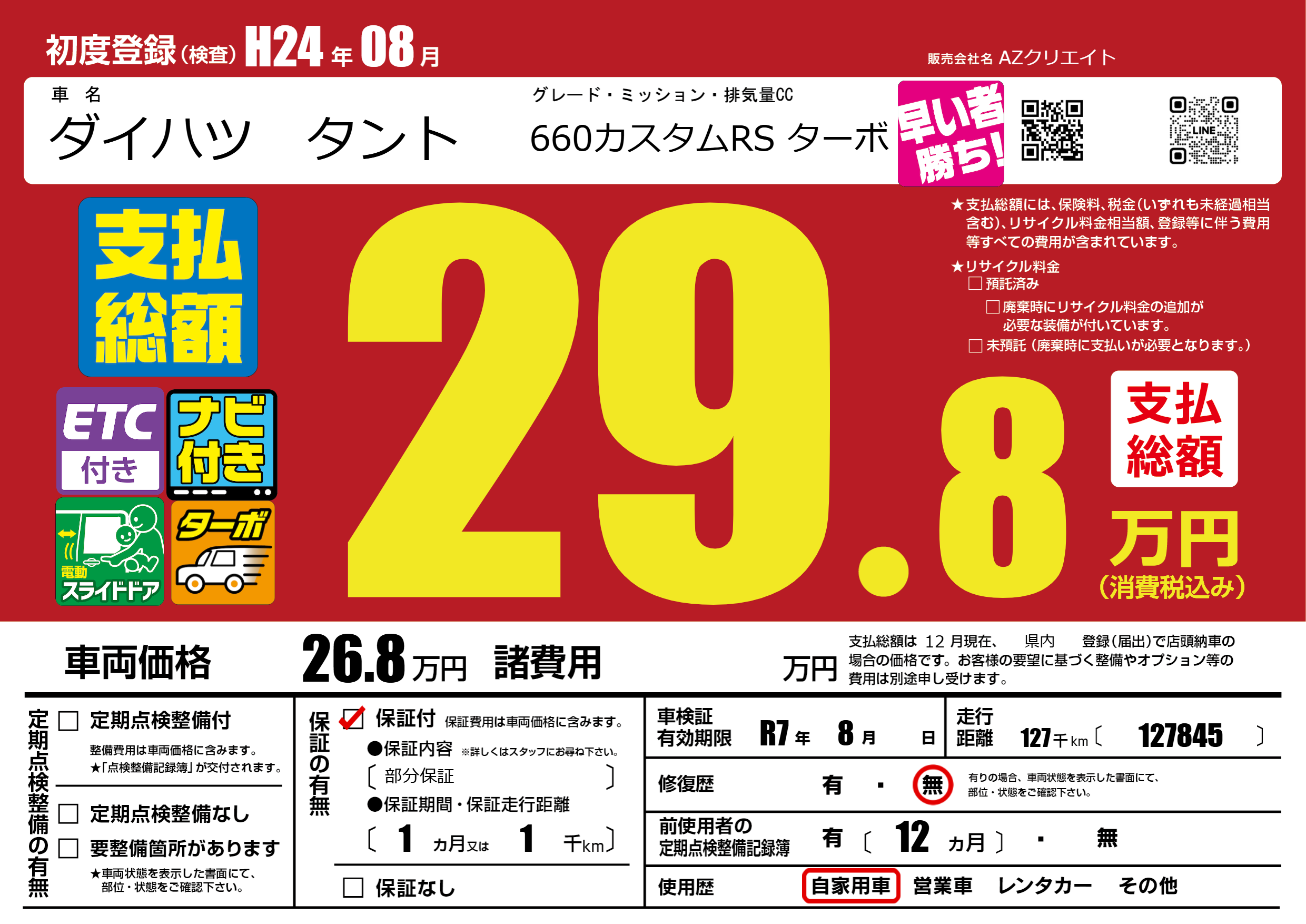 | 走行キロ | 12.7万km | 初年度登録 | H24年08月 |