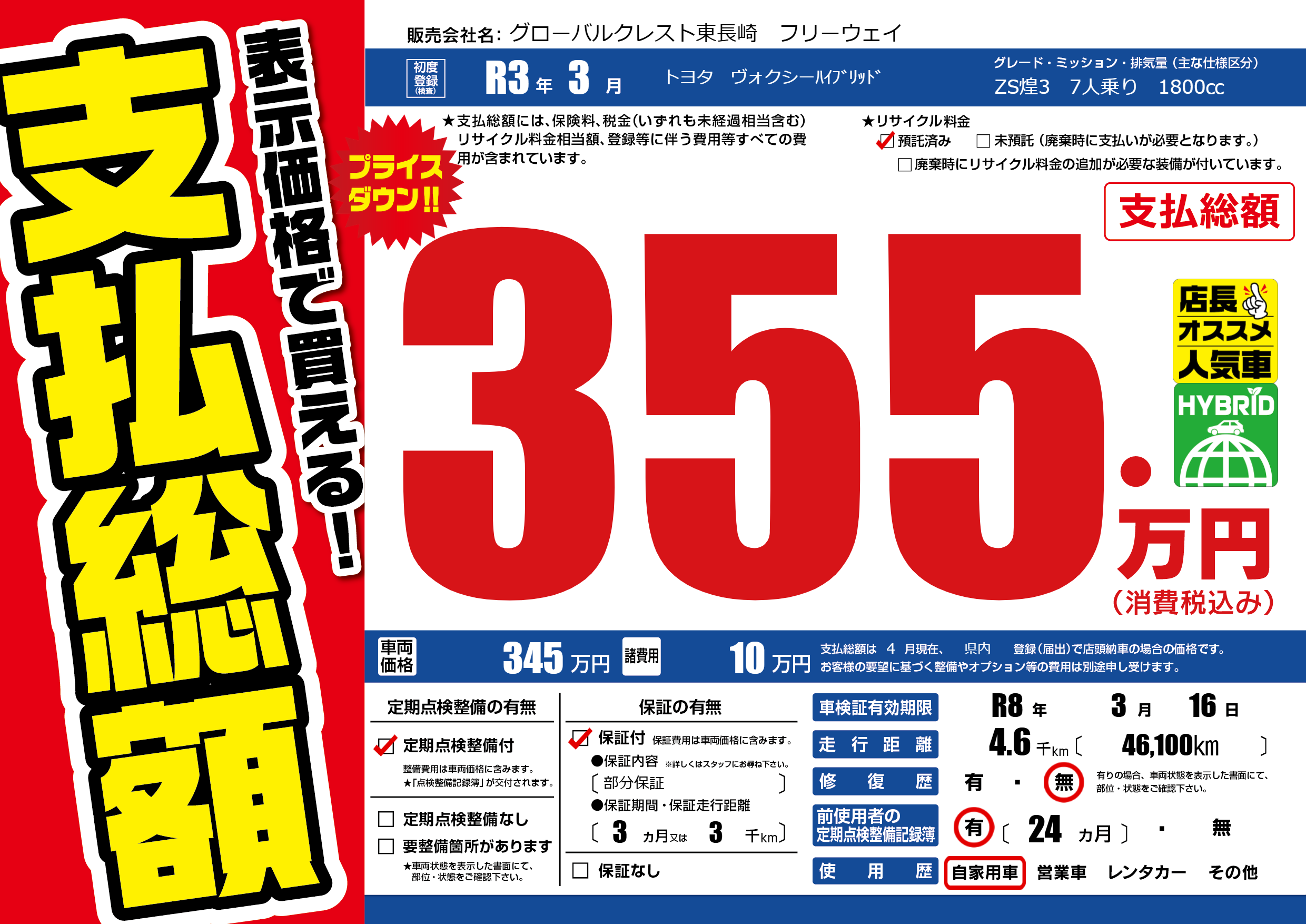 | 車名 | トヨタ ヴォクシーハイブリッド | グレード ミッション 排気量 |