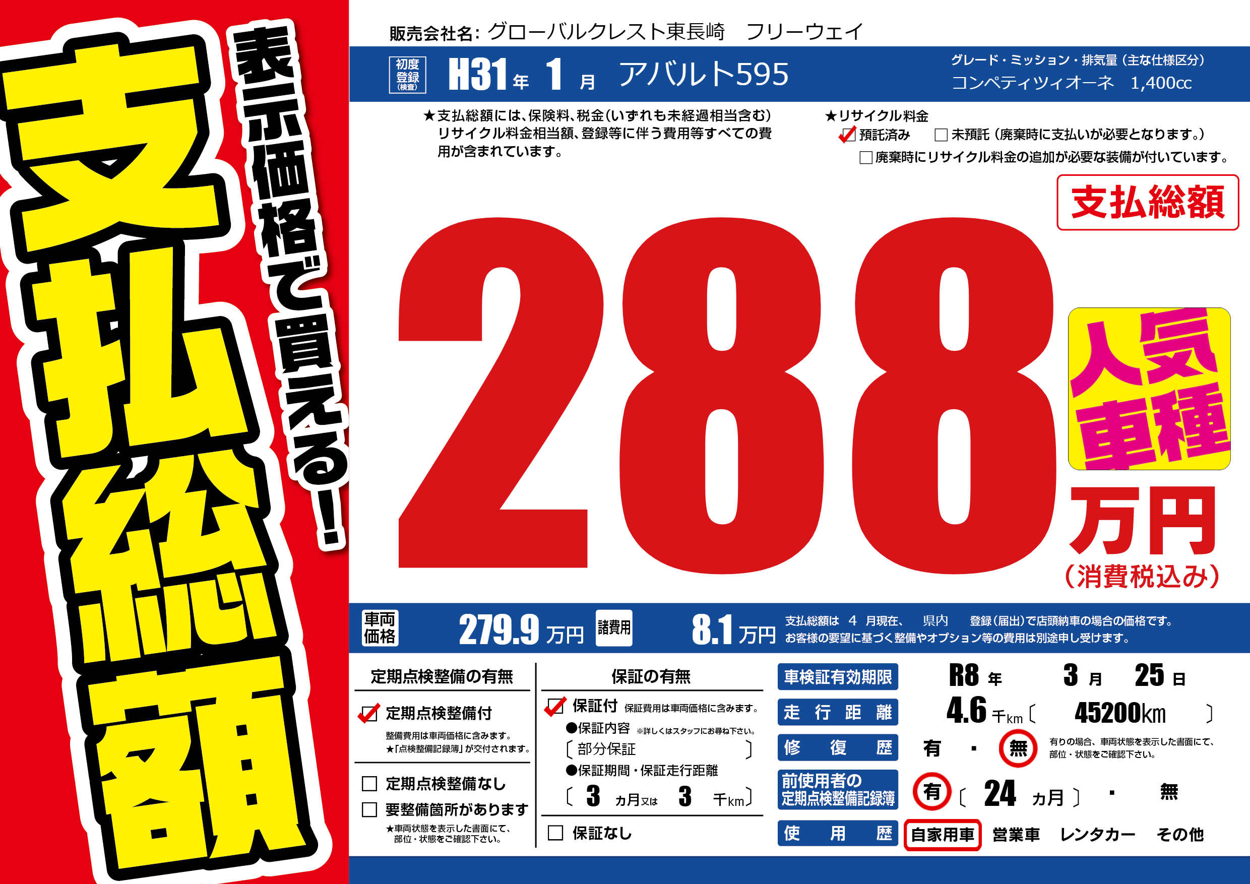 | 走行キロ | 0.4万km | 初年度登録 | H31年1月 |