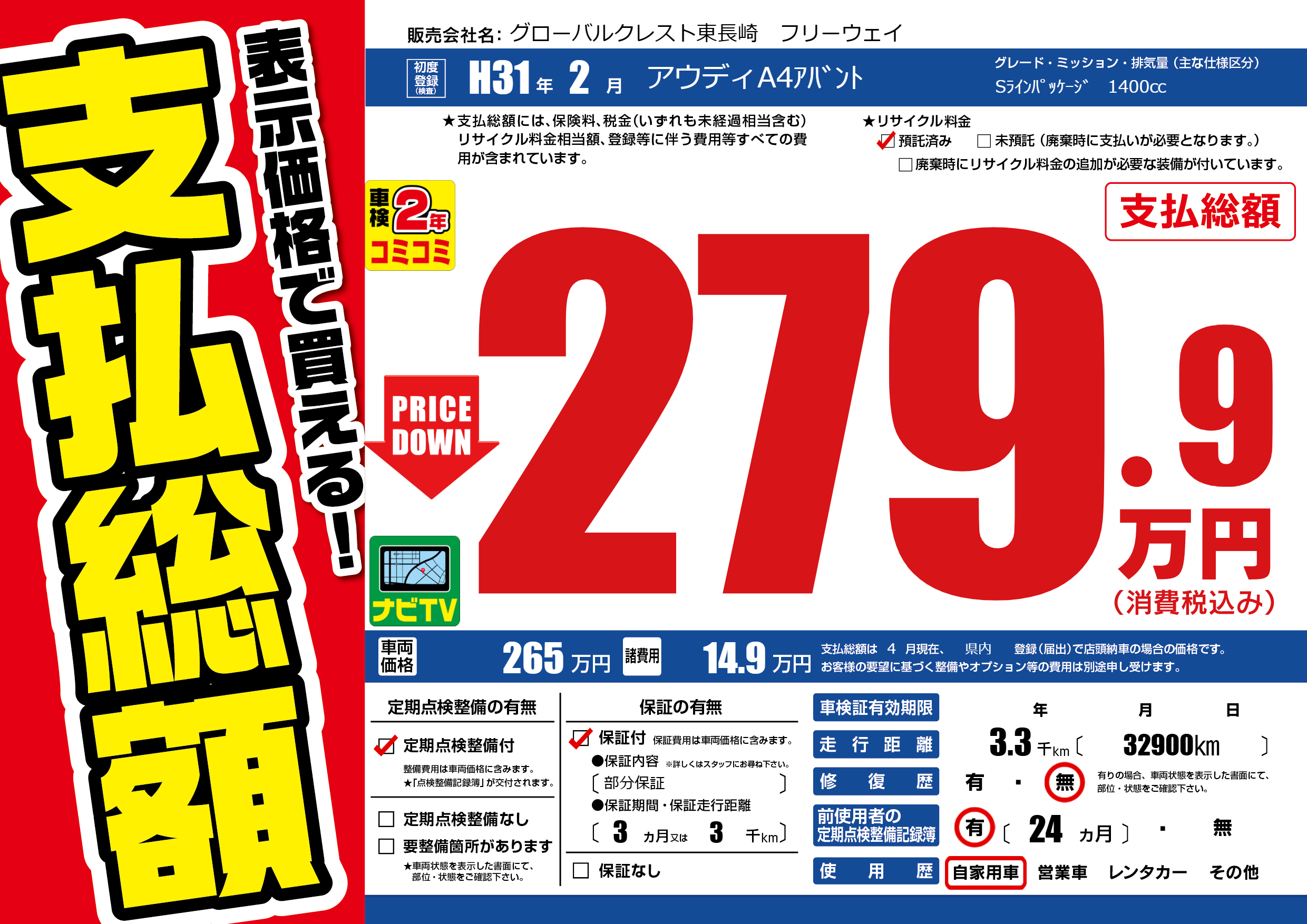 | 走行キロ | 0.3万km | 初年度登録 | H31年2月 |