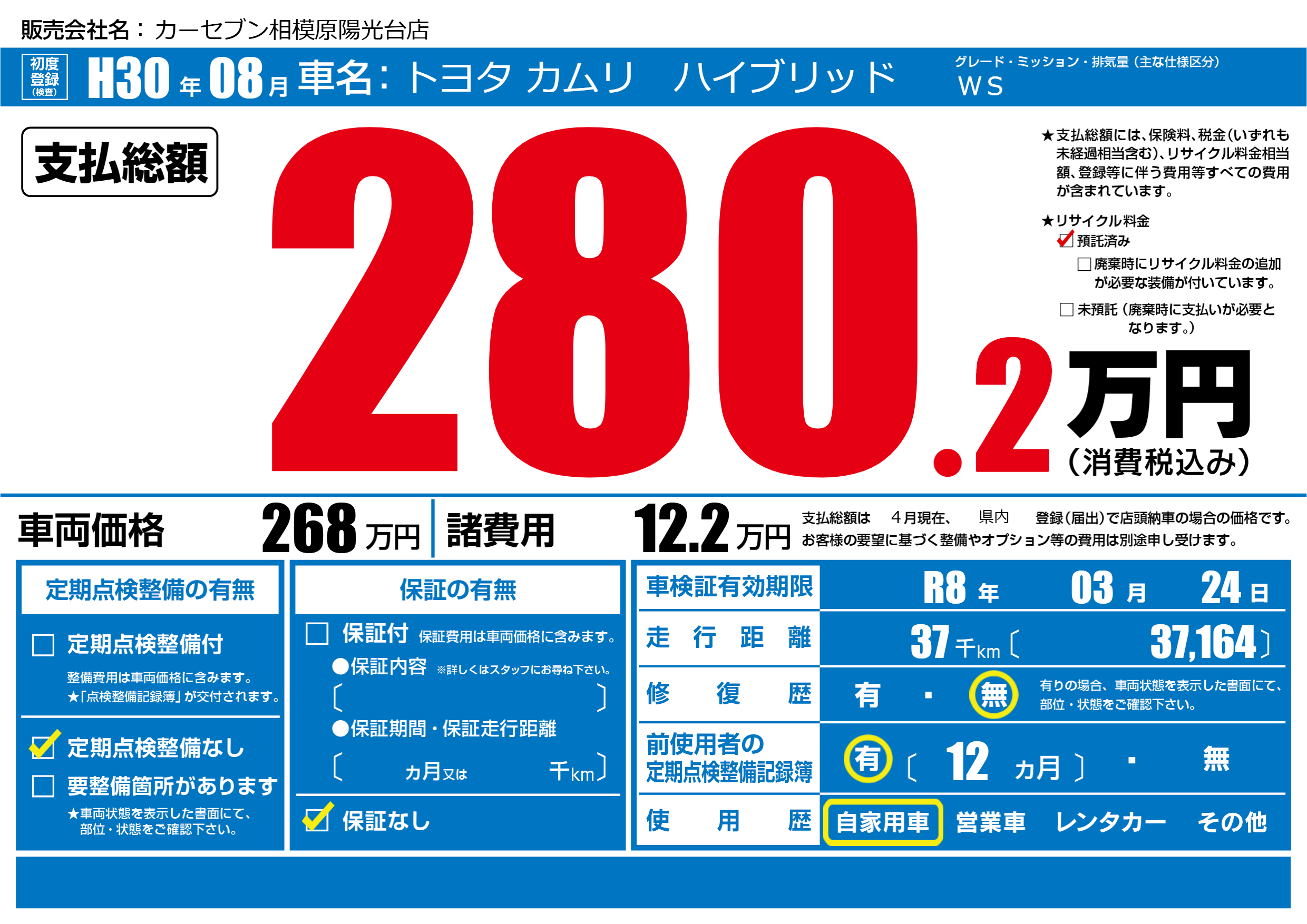 | 車名 | トヨタ カムリ ハイブリッド | グレード ミッション 排気量 |
