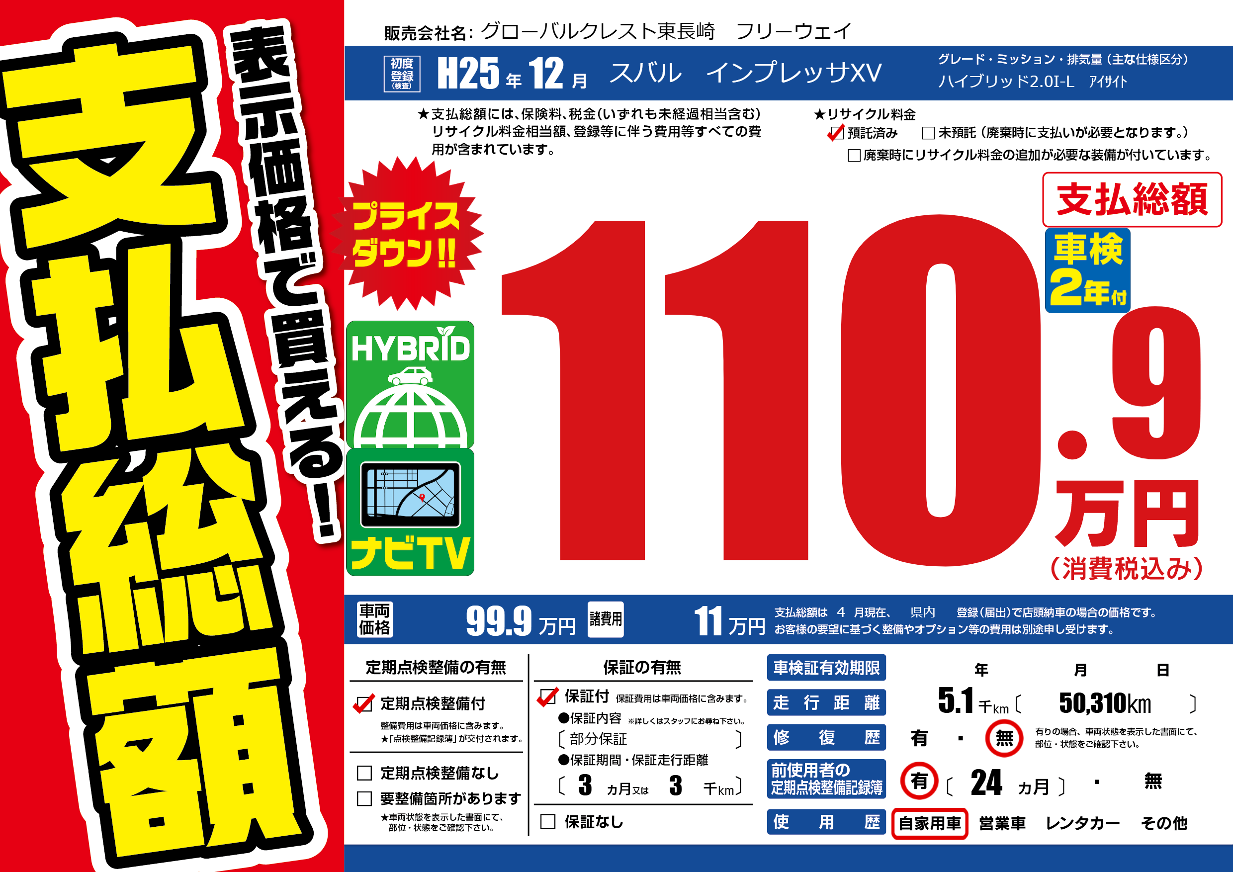 | 車名 | スバル インプレッサXV | グレード ミッション 排気量 |