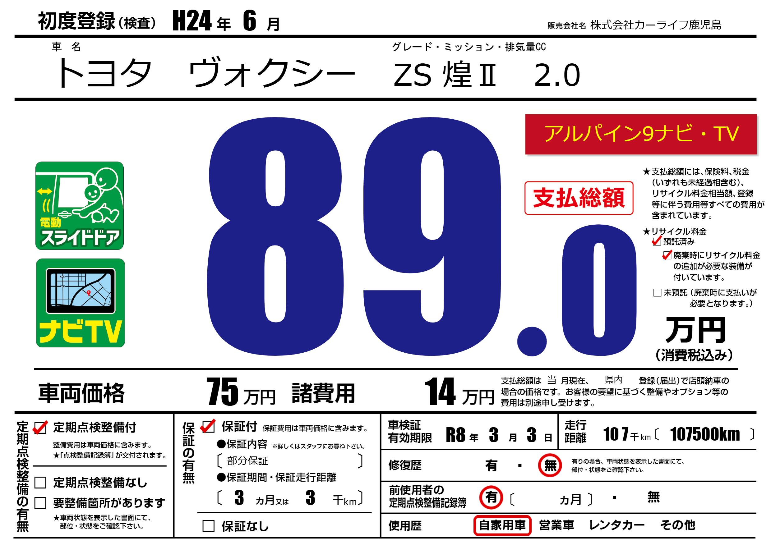 | 走行キロ | 1万km | 初年度登録 | H24年6月 |