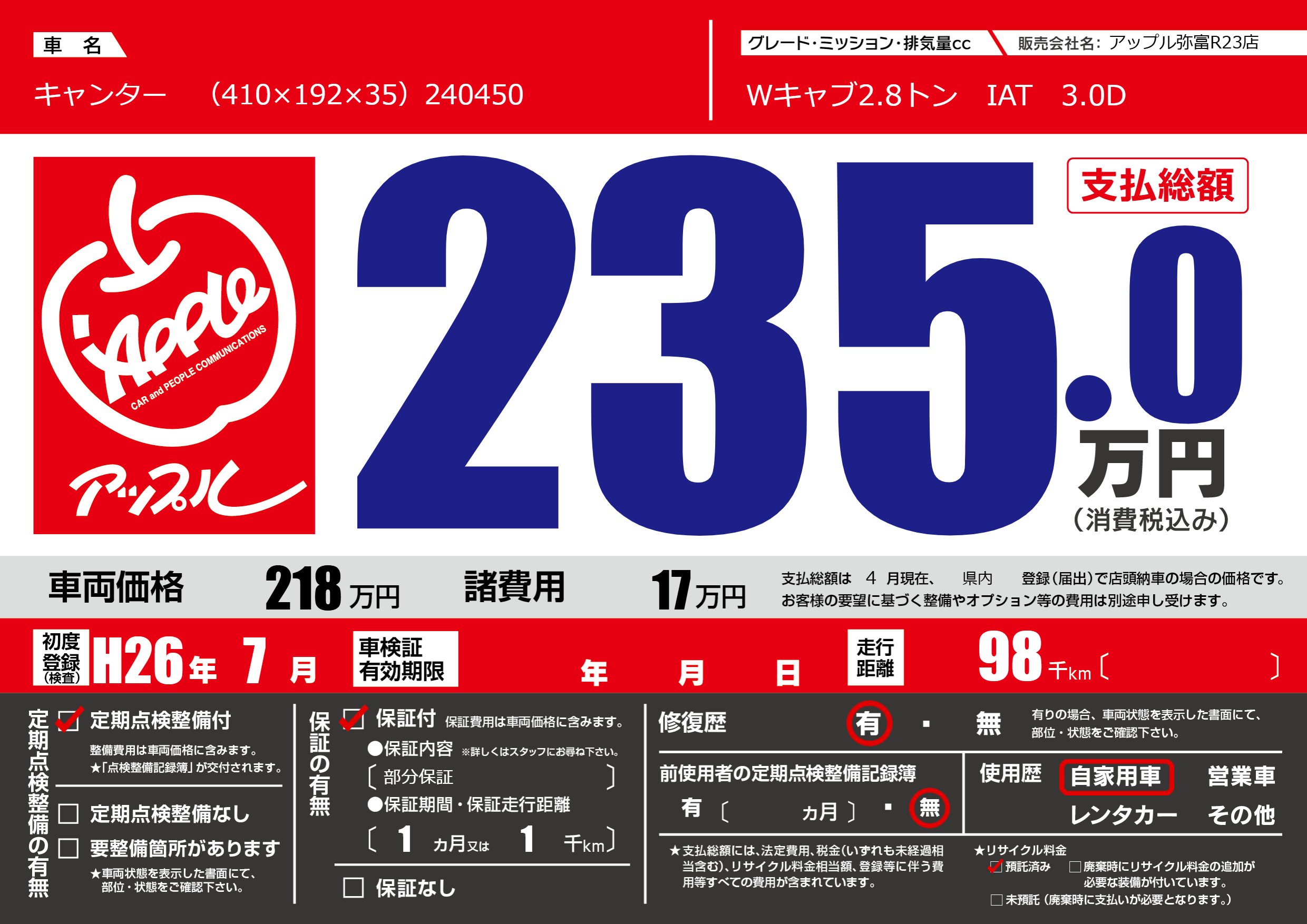 | 車名 | キャンター (410×192×35)240450 | グレード ミッション 排気量 |