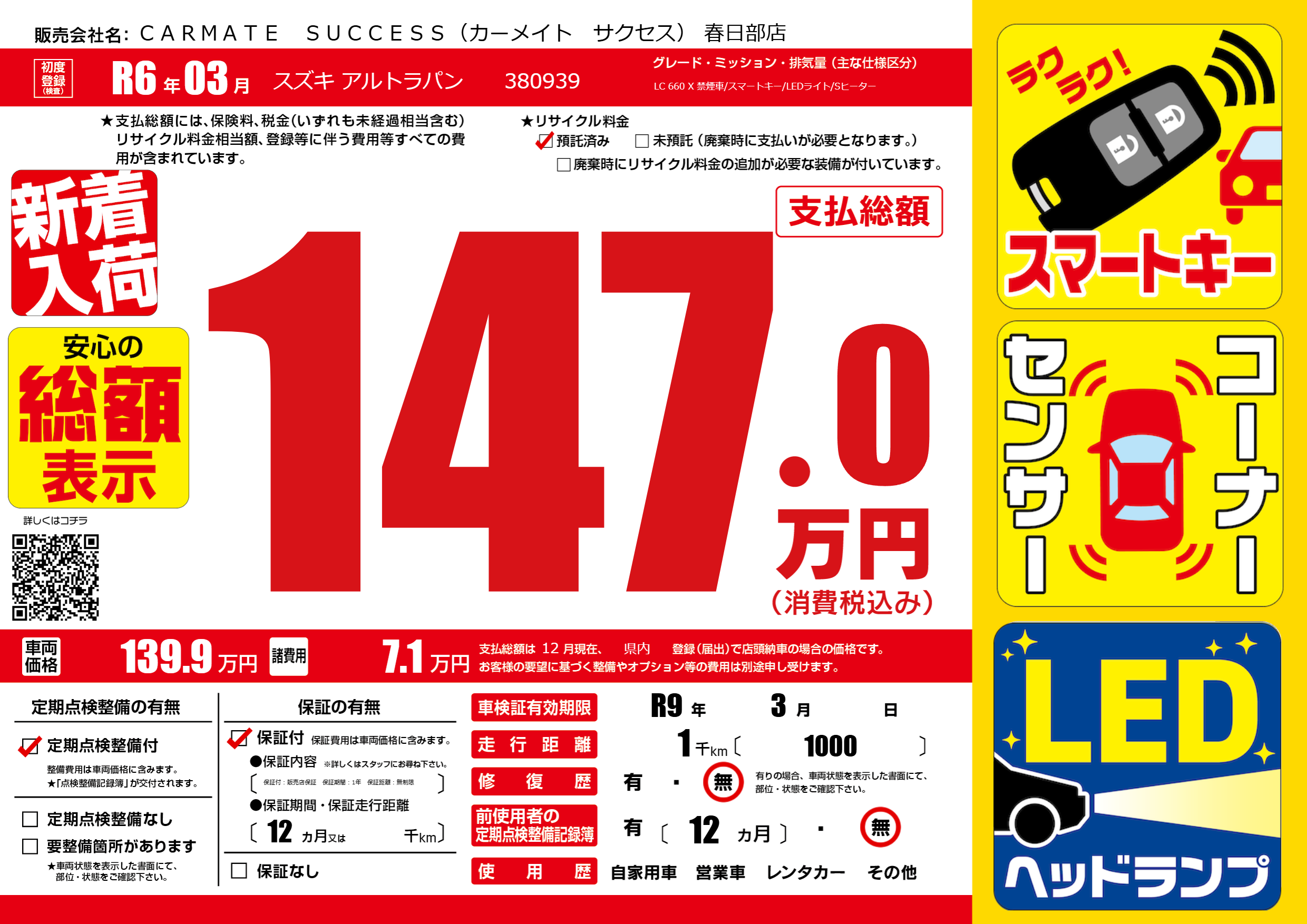 | 走行キロ | 0.1万km | 初年度登録 | R6年03月 |