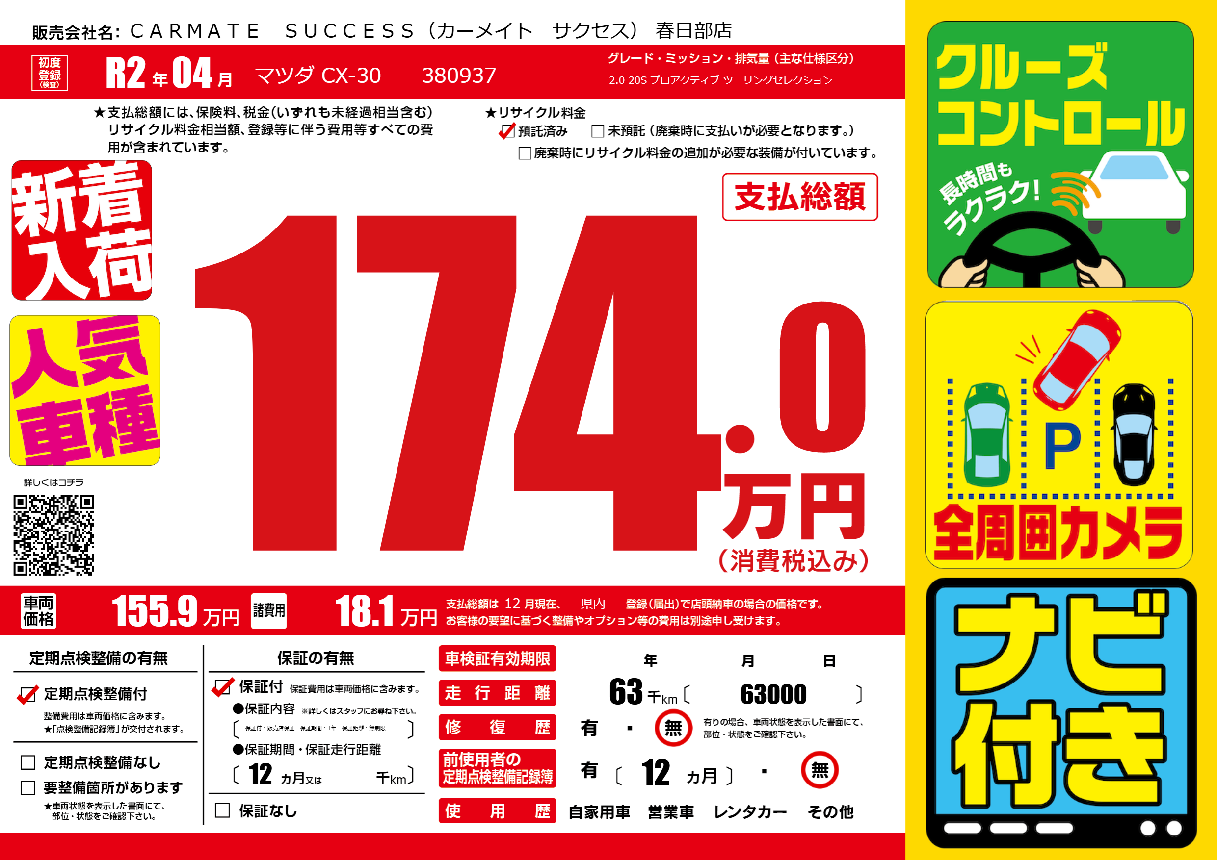 | 車名 | マツダ CX-30 380937 | グレード ミッション 排気量 |