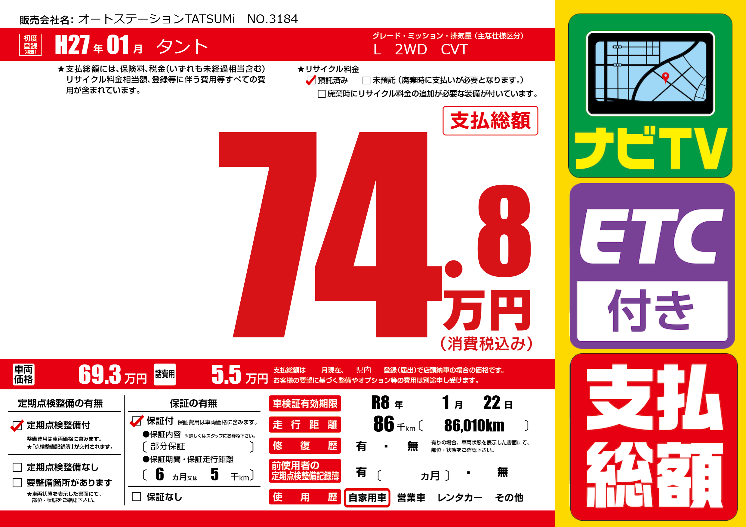 | 走行キロ | 8.6万km | 初年度登録 | H27年01月 |