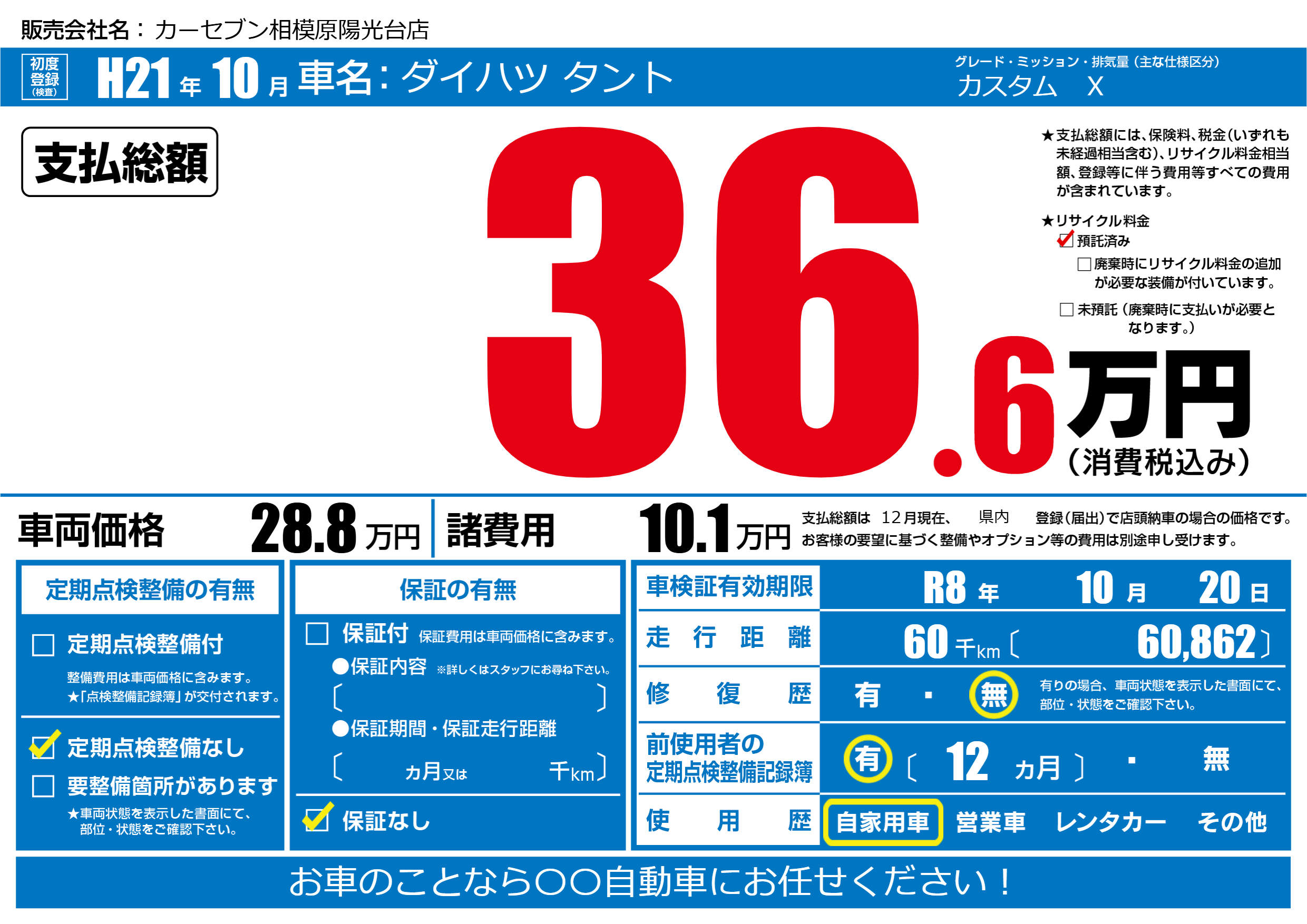 | 車名 | ダイハツ タント | グレード ミッション 排気量 |