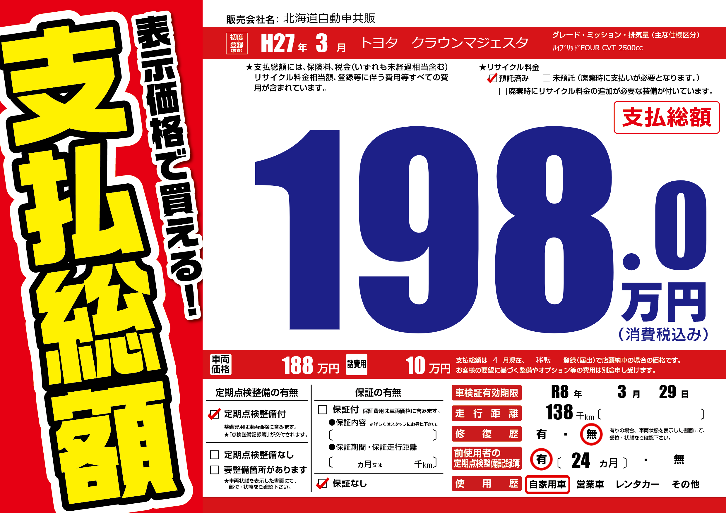 | 車名 | トヨタ クラウンマジェスタ | グレード ミッション 排気量 |