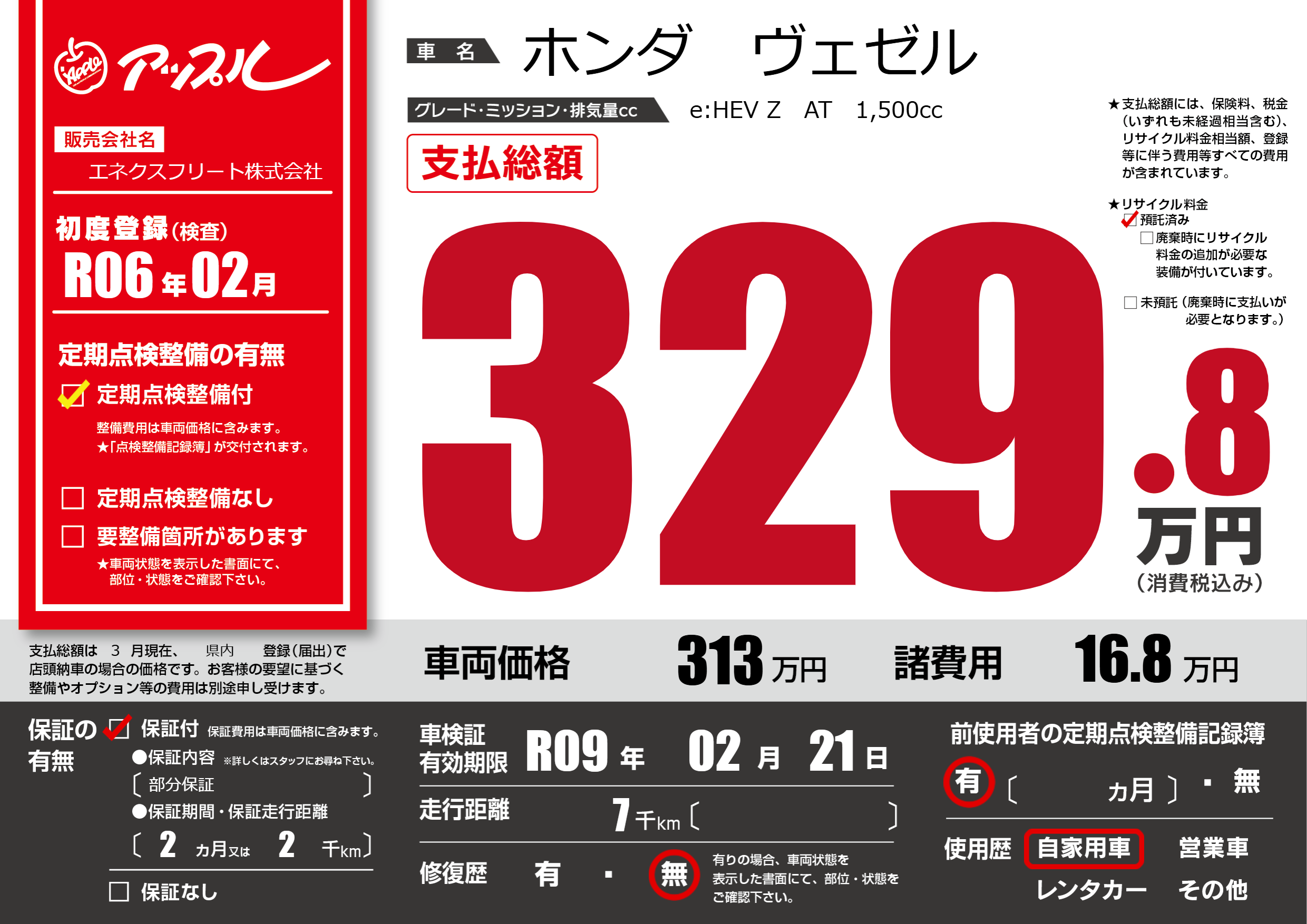 | 車名 | ホンダ ヴェゼル | グレード ミッション 排気量 |