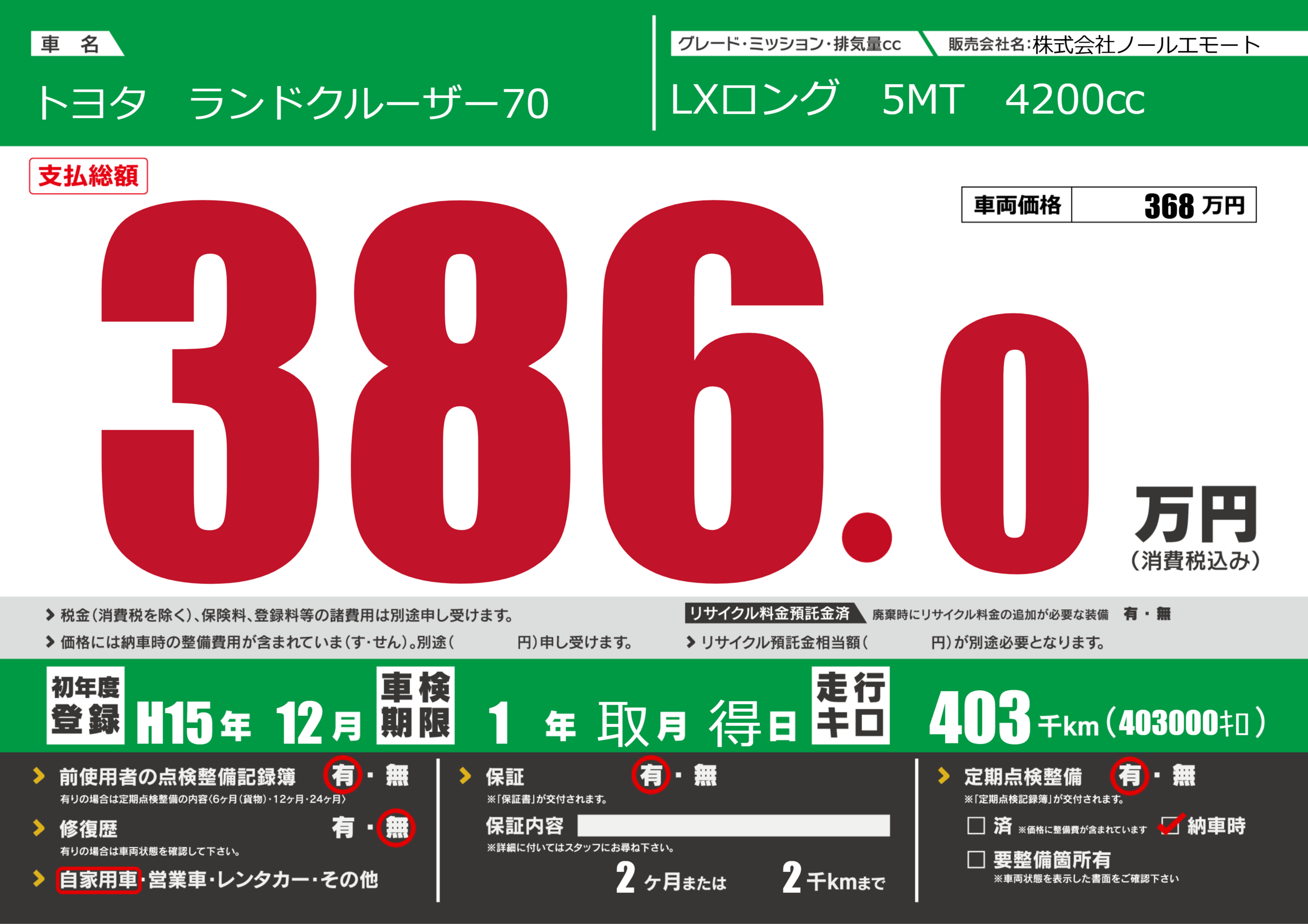 | 車名 | トヨタ ランドクルーザー70 | グレード ミッション 排気量 |
