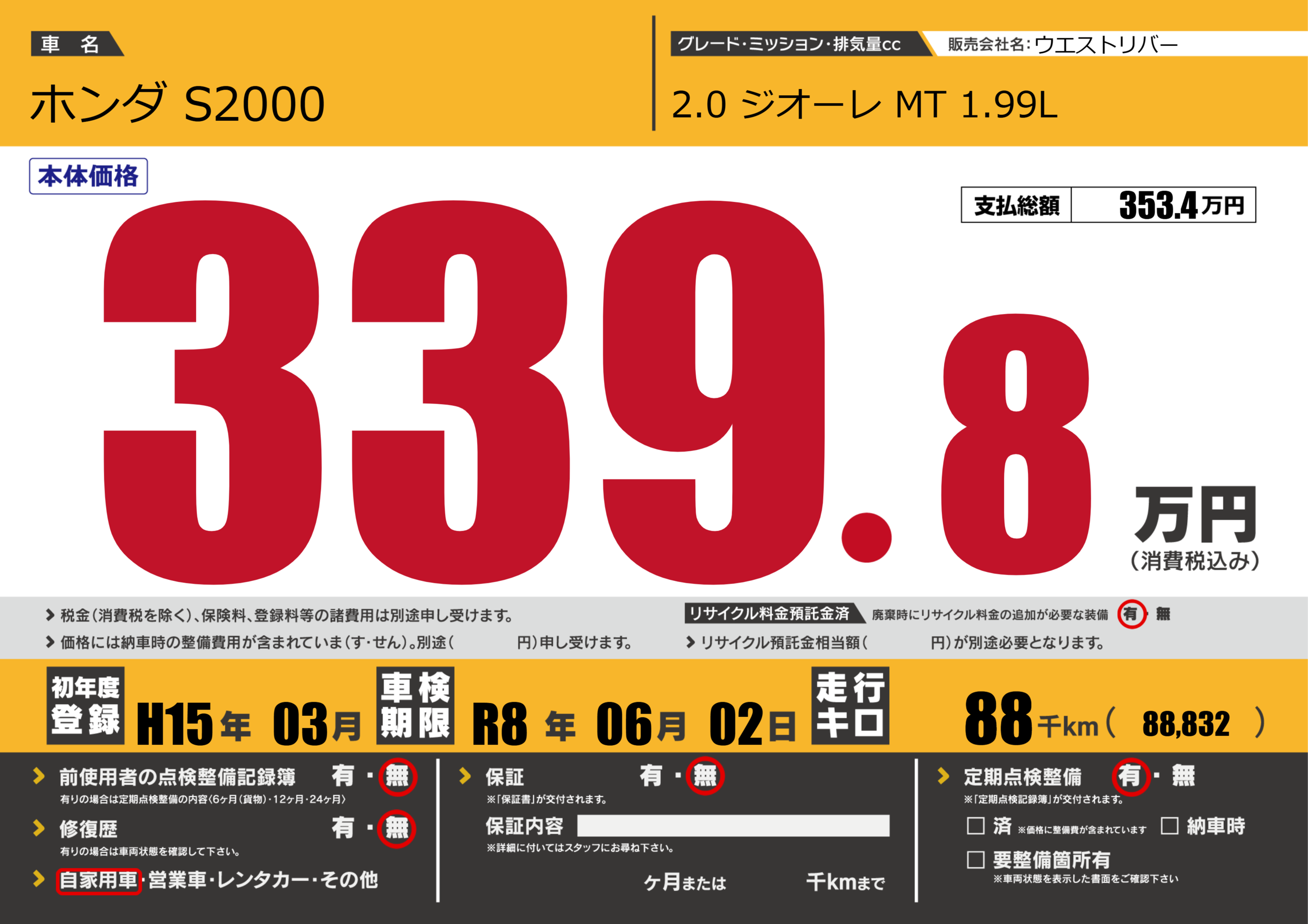 | 車名 | ホンダ S2000 | グレード ミッション 排気量 |