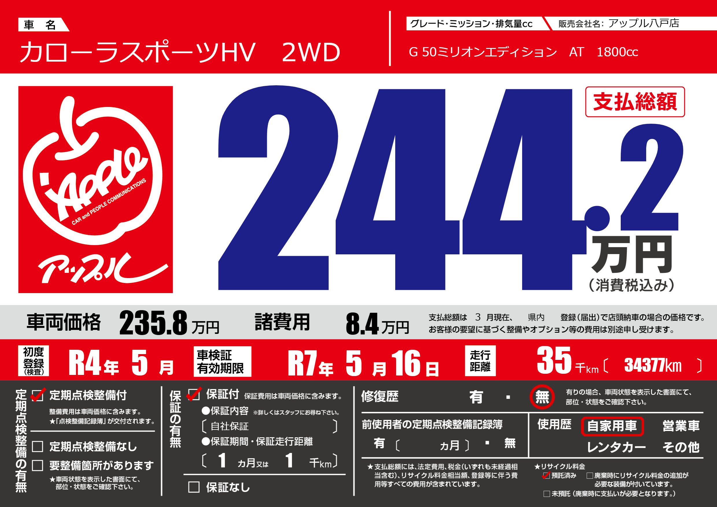 | 走行キロ | 3.5万km | 初年度登録 | R4年5月 |