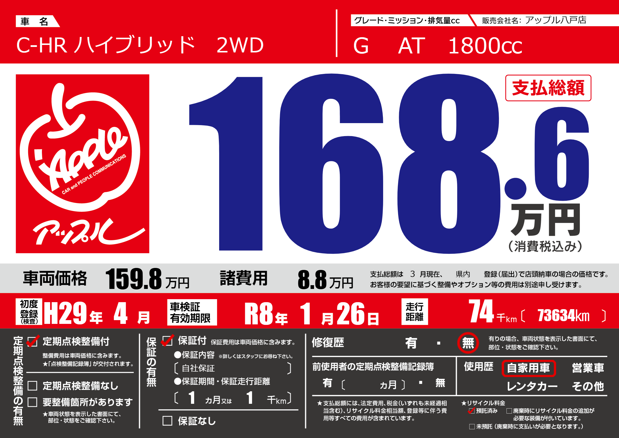 | 車名 | C-HR ハイブリッド 2WD | グレード ミッション 排気量 |