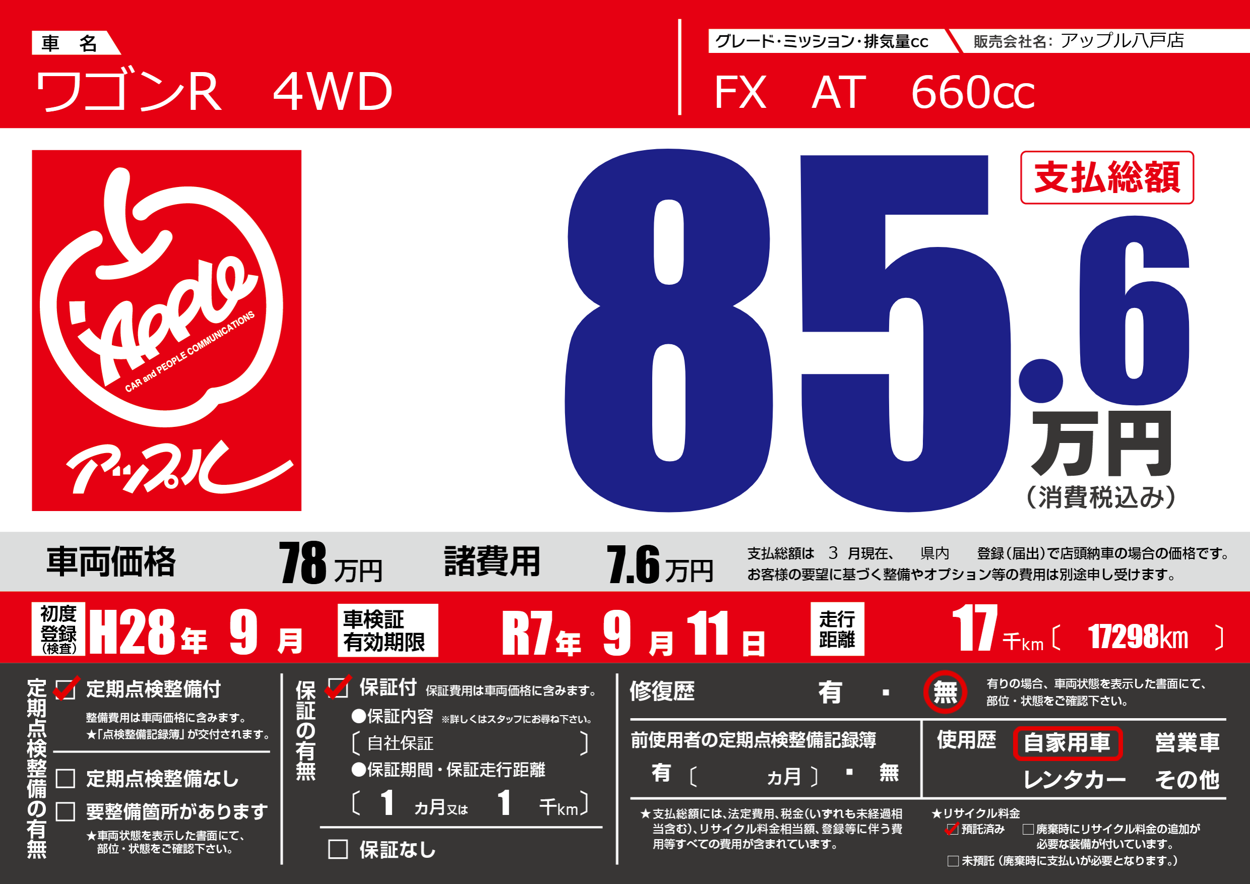 | 車検制限 | R7年 9月 11日 | ||