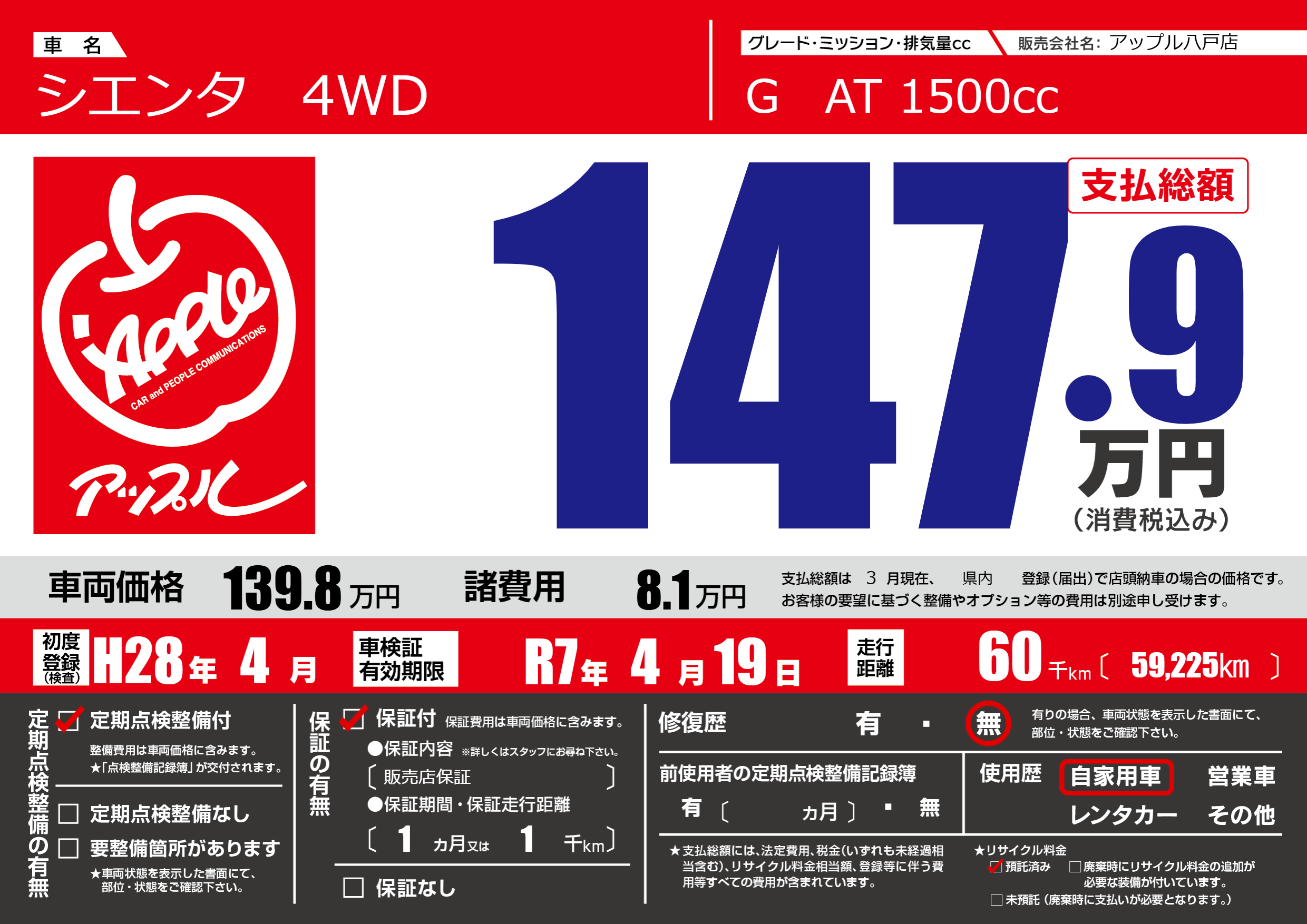 | 車名 | シエンタ 4WD | グレード ミッション 排気量 |