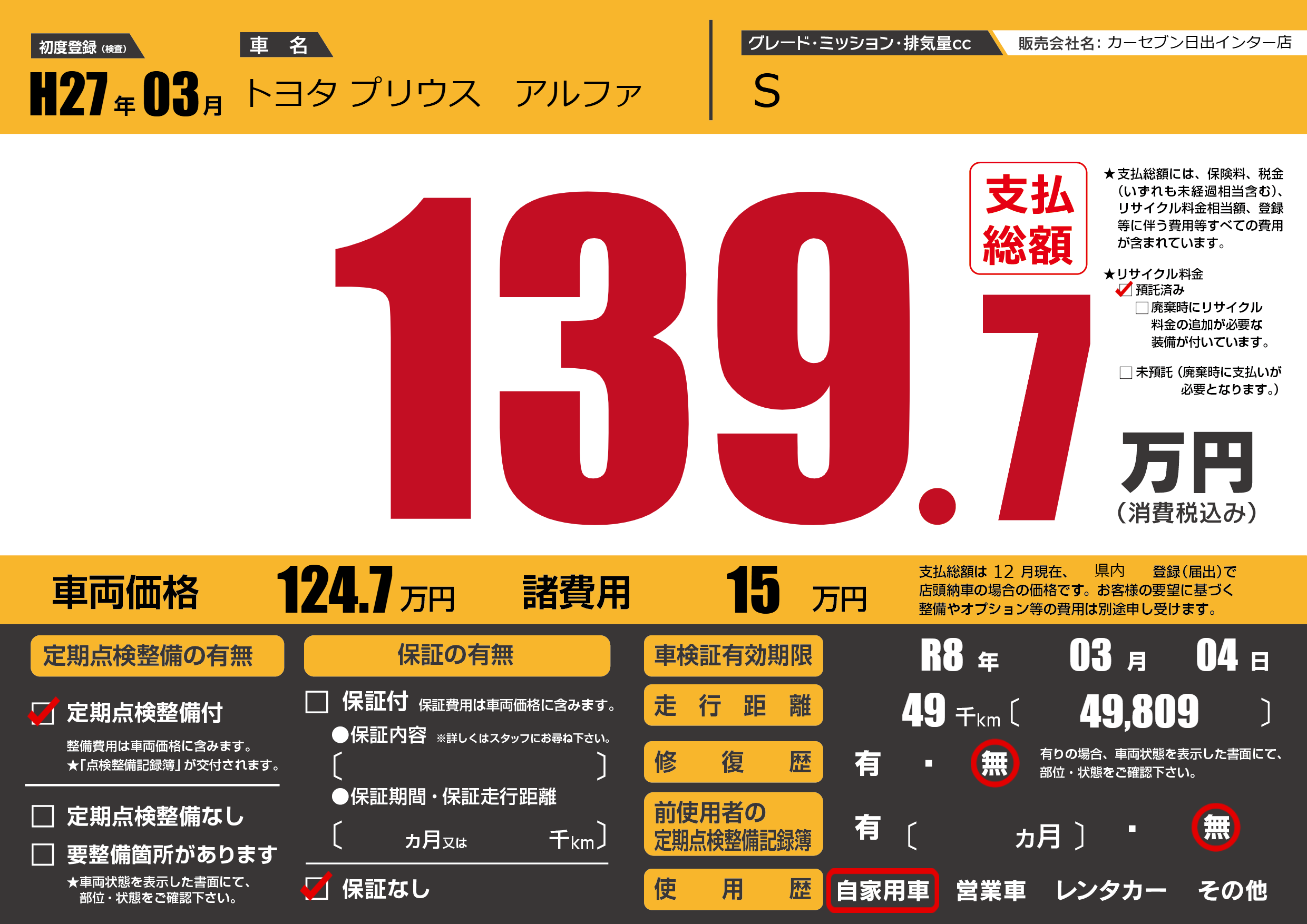 | 走行キロ | 4.9万km | 初年度登録 | H27年03月 |
