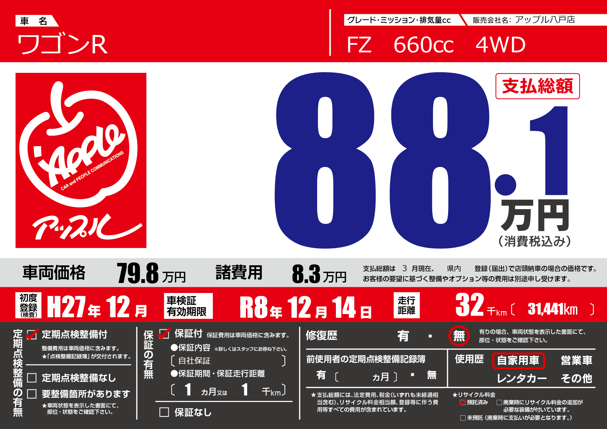 | 車名 | ワゴンR | グレード ミッション 排気量 |