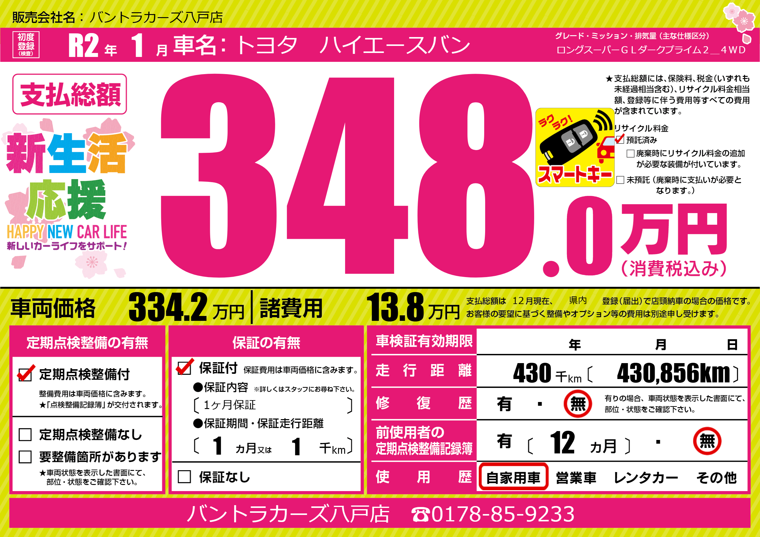 | 走行キロ | 43万km | 初年度登録 | R2年1月 |