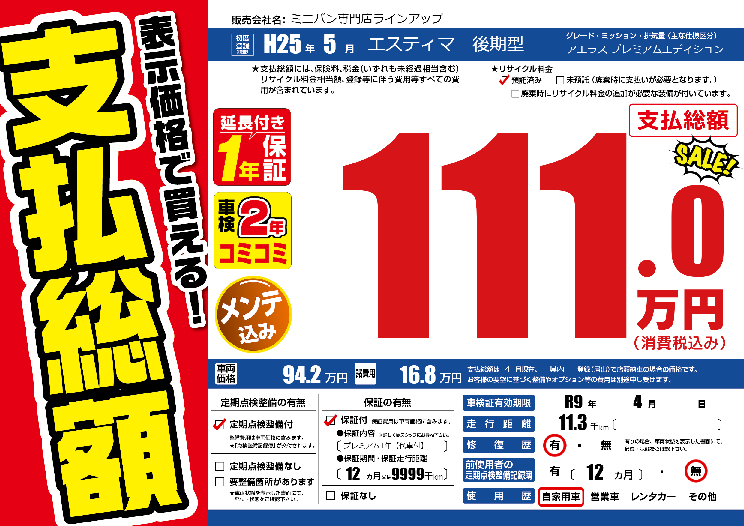 | 走行キロ | 1.1万km | 初年度登録 | H25年5月 |
