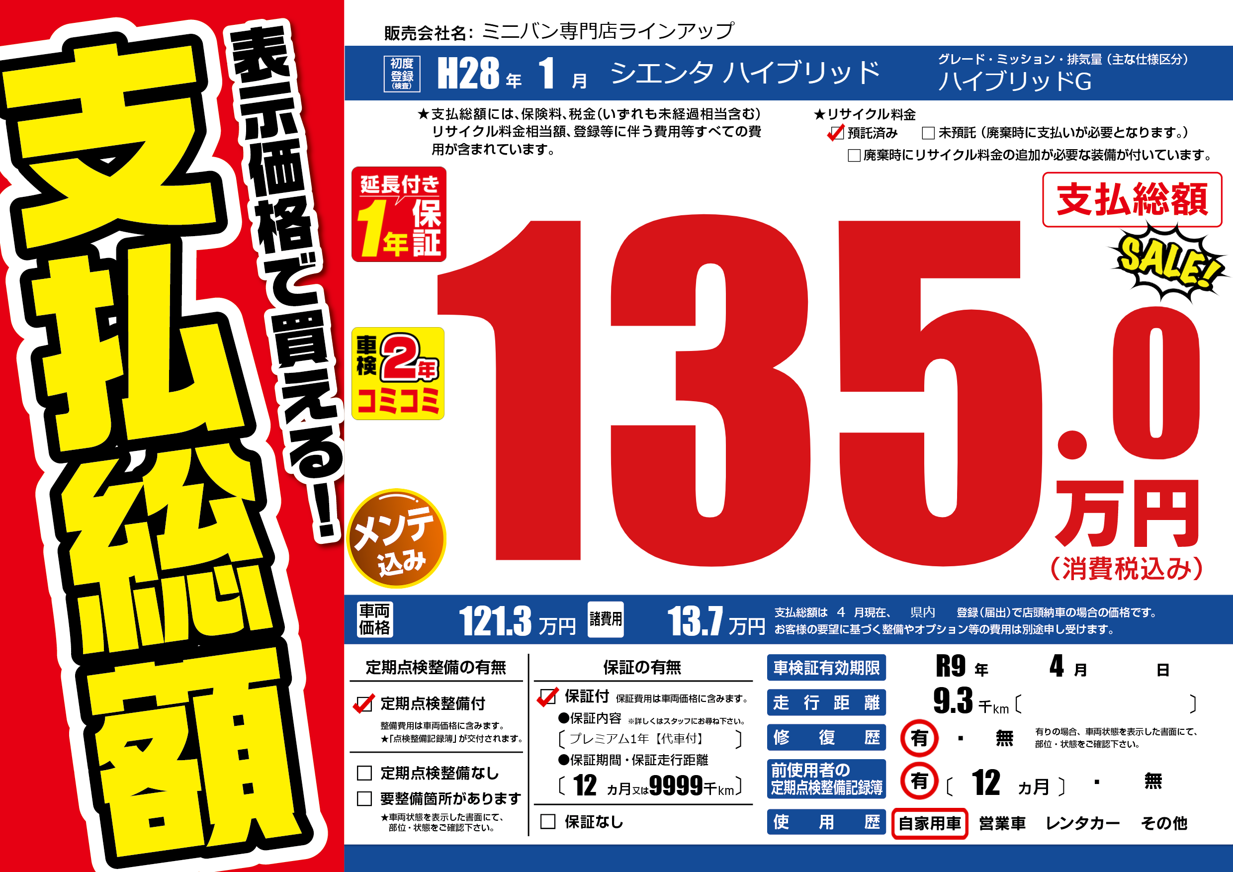 | 車名 | シエンタ ハイブリッド | グレード ミッション 排気量 |
