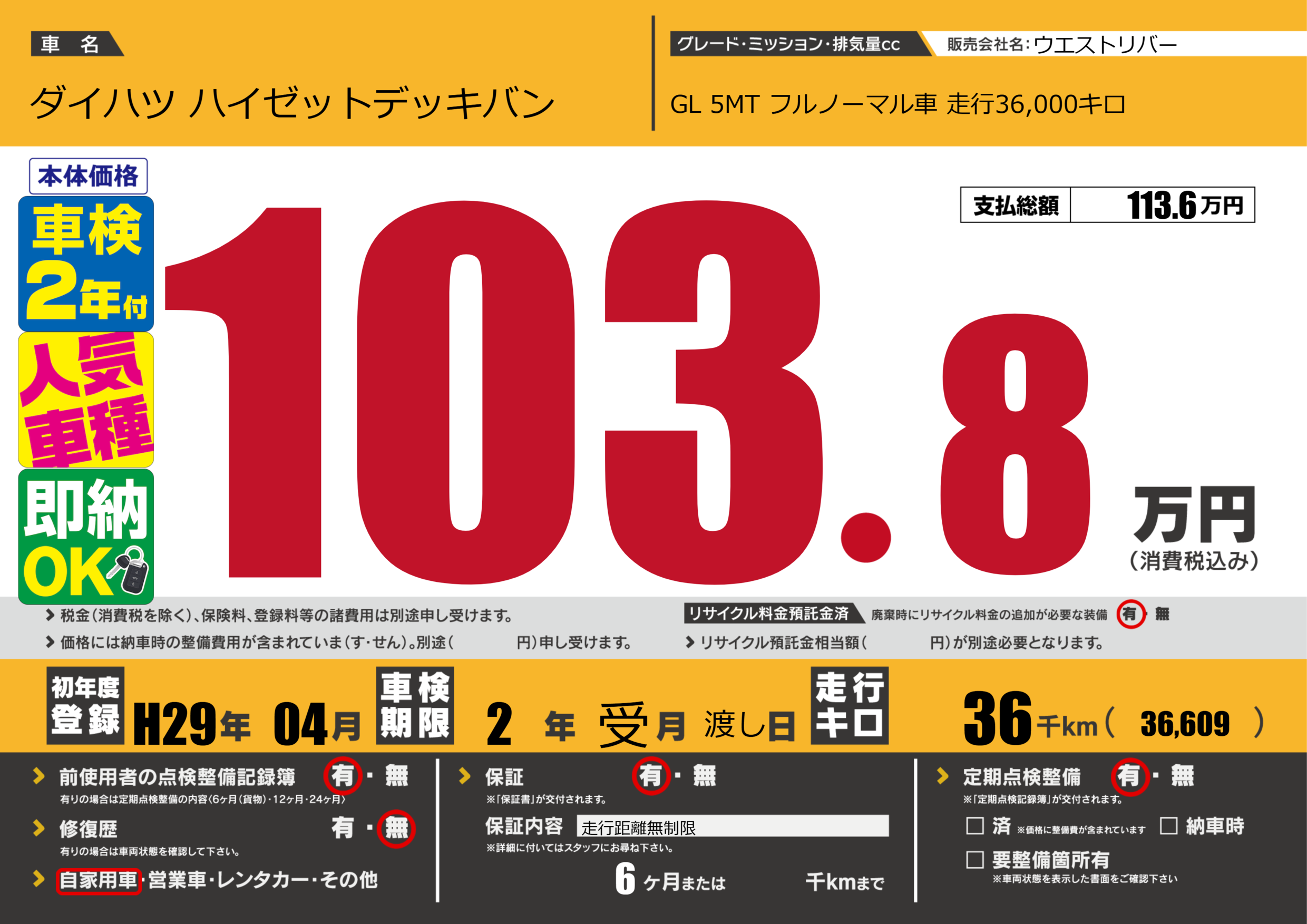 | 走行キロ | 3.6万km | 初年度登録 | H29年04月 |