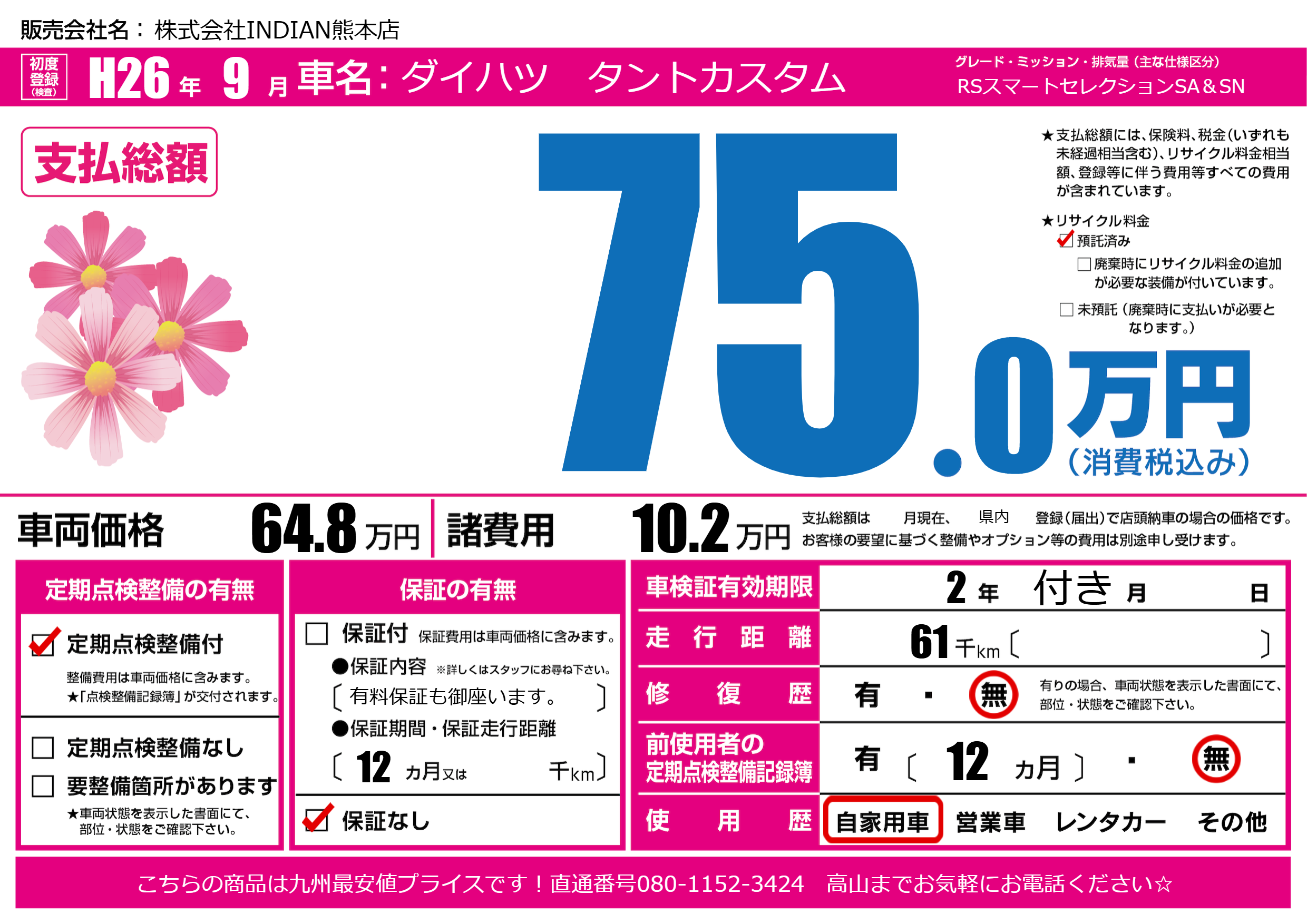 あり | リサイクル預託金相当額 | ( 0円)が別途必要 |